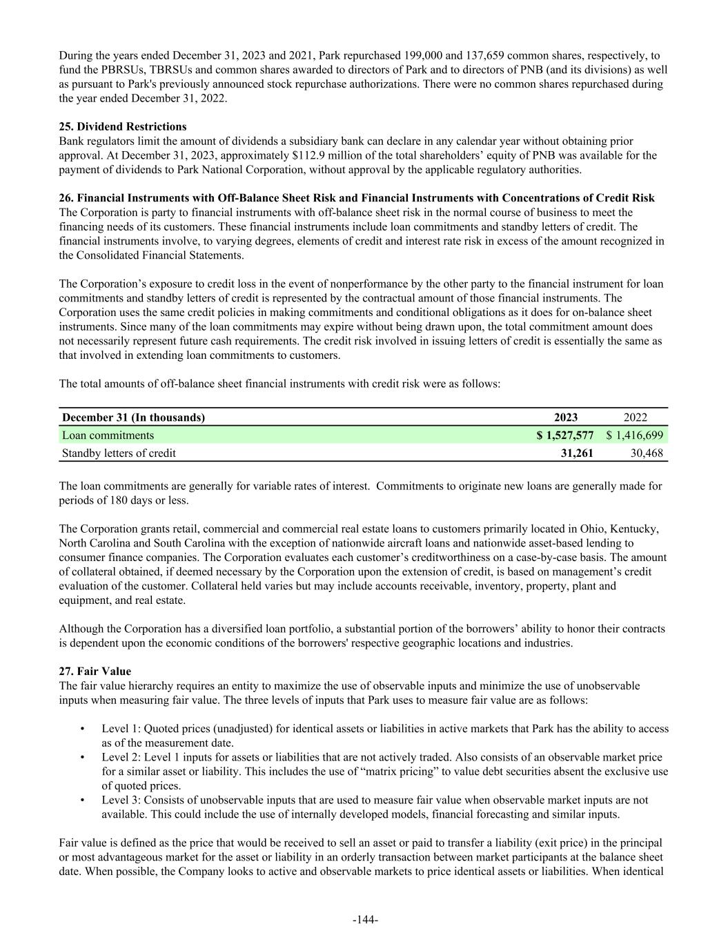 During the years ended December 31, 2023 and 2021, Park repurchased 199,000 and 137,659 common shares, respectively, to fund the PBRSUs, TBRSUs and common shares awarded to directors of Park and to directors of PNB (and its divisions) as well as pursuant to Park's previously announced stock repurchase authorizations. There were no common shares repurchased during the year ended December 31, 2022. 25. Dividend Restrictions Bank regulators limit the amount of dividends a subsidiary bank can declare in any calendar year without obtaining prior approval. At December 31, 2023, approximately $112.9 million of the total shareholders’ equity of PNB was available for the payment of dividends to Park National Corporation, without approval by the applicable regulatory authorities. 26. Financial Instruments with Off-Balance Sheet Risk and Financial Instruments with Concentrations of Credit Risk The Corporation is party to financial instruments with off-balance sheet risk in the normal course of business to meet the financing needs of its customers. These financial instruments include loan commitments and standby letters of credit. The financial instruments involve, to varying degrees, elements of credit and interest rate risk in excess of the amount recognized in the Consolidated Financial Statements. The Corporation’s exposure to credit loss in the event of nonperformance by the other party to the financial instrument for loan commitments and standby letters of credit is represented by the contractual amount of those financial instruments. The Corporation uses the same credit policies in making commitments and conditional obligations as it does for on-balance sheet instruments. Since many of the loan commitments may expire without being drawn upon, the total commitment amount does not necessarily represent future cash requirements. The credit risk involved in issuing letters of credit is essentially the same as that involved in extending loan commitments to customers. The total amounts of off-balance sheet financial instruments with credit risk were as follows: December 31 (In thousands) 2023 2022 Loan commitments $ 1,527,577 $ 1,416,699 Standby letters of credit 31,261 30,468 The loan commitments are generally for variable rates of interest. Commitments to originate new loans are generally made for periods of 180 days or less. The Corporation grants retail, commercial and commercial real estate loans to customers primarily located in Ohio, Kentucky, North Carolina and South Carolina with the exception of nationwide aircraft loans and nationwide asset-based lending to consumer finance companies. The Corporation evaluates each customer’s creditworthiness on a case-by-case basis. The amount of collateral obtained, if deemed necessary by the Corporation upon the extension of credit, is based on management’s credit evaluation of the customer. Collateral held varies but may include accounts receivable, inventory, property, plant and equipment, and real estate. Although the Corporation has a diversified loan portfolio, a substantial portion of the borrowers’ ability to honor their contracts is dependent upon the economic conditions of the borrowers' respective geographic locations and industries. 27. Fair Value The fair value hierarchy requires an entity to maximize the use of observable inputs and minimize the use of unobservable inputs when measuring fair value. The three levels of inputs that Park uses to measure fair value are as follows: • Level 1: Quoted prices (unadjusted) for identical assets or liabilities in active markets that Park has the ability to access as of the measurement date. • Level 2: Level 1 inputs for assets or liabilities that are not actively traded. Also consists of an observable market price for a similar asset or liability. This includes the use of “matrix pricing” to value debt securities absent the exclusive use of quoted prices. • Level 3: Consists of unobservable inputs that are used to measure fair value when observable market inputs are not available. This could include the use of internally developed models, financial forecasting and similar inputs. Fair value is defined as the price that would be received to sell an asset or paid to transfer a liability (exit price) in the principal or most advantageous market for the asset or liability in an orderly transaction between market participants at the balance sheet date. When possible, the Company looks to active and observable markets to price identical assets or liabilities. When identical -144-