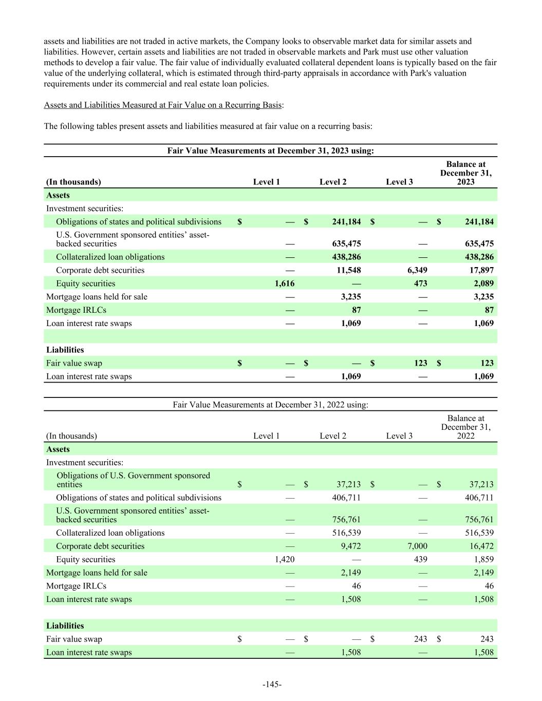 assets and liabilities are not traded in active markets, the Company looks to observable market data for similar assets and liabilities. However, certain assets and liabilities are not traded in observable markets and Park must use other valuation methods to develop a fair value. The fair value of individually evaluated collateral dependent loans is typically based on the fair value of the underlying collateral, which is estimated through third-party appraisals in accordance with Park's valuation requirements under its commercial and real estate loan policies. Assets and Liabilities Measured at Fair Value on a Recurring Basis: The following tables present assets and liabilities measured at fair value on a recurring basis: Fair Value Measurements at December 31, 2023 using: (In thousands) Level 1 Level 2 Level 3 Balance at December 31, 2023 Assets Investment securities: Obligations of states and political subdivisions $ — $ 241,184 $ — $ 241,184 U.S. Government sponsored entities’ asset- backed securities — 635,475 — 635,475 Collateralized loan obligations — 438,286 — 438,286 Corporate debt securities — 11,548 6,349 17,897 Equity securities 1,616 — 473 2,089 Mortgage loans held for sale — 3,235 — 3,235 Mortgage IRLCs — 87 — 87 Loan interest rate swaps — 1,069 — 1,069 Liabilities Fair value swap $ — $ — $ 123 $ 123 Loan interest rate swaps — 1,069 — 1,069 Fair Value Measurements at December 31, 2022 using: (In thousands) Level 1 Level 2 Level 3 Balance at December 31, 2022 Assets Investment securities: Obligations of U.S. Government sponsored entities $ — $ 37,213 $ — $ 37,213 Obligations of states and political subdivisions — 406,711 — 406,711 U.S. Government sponsored entities’ asset- backed securities — 756,761 — 756,761 Collateralized loan obligations — 516,539 — 516,539 Corporate debt securities — 9,472 7,000 16,472 Equity securities 1,420 — 439 1,859 Mortgage loans held for sale — 2,149 — 2,149 Mortgage IRLCs — 46 — 46 Loan interest rate swaps — 1,508 — 1,508 Liabilities Fair value swap $ — $ — $ 243 $ 243 Loan interest rate swaps — 1,508 — 1,508 -145-