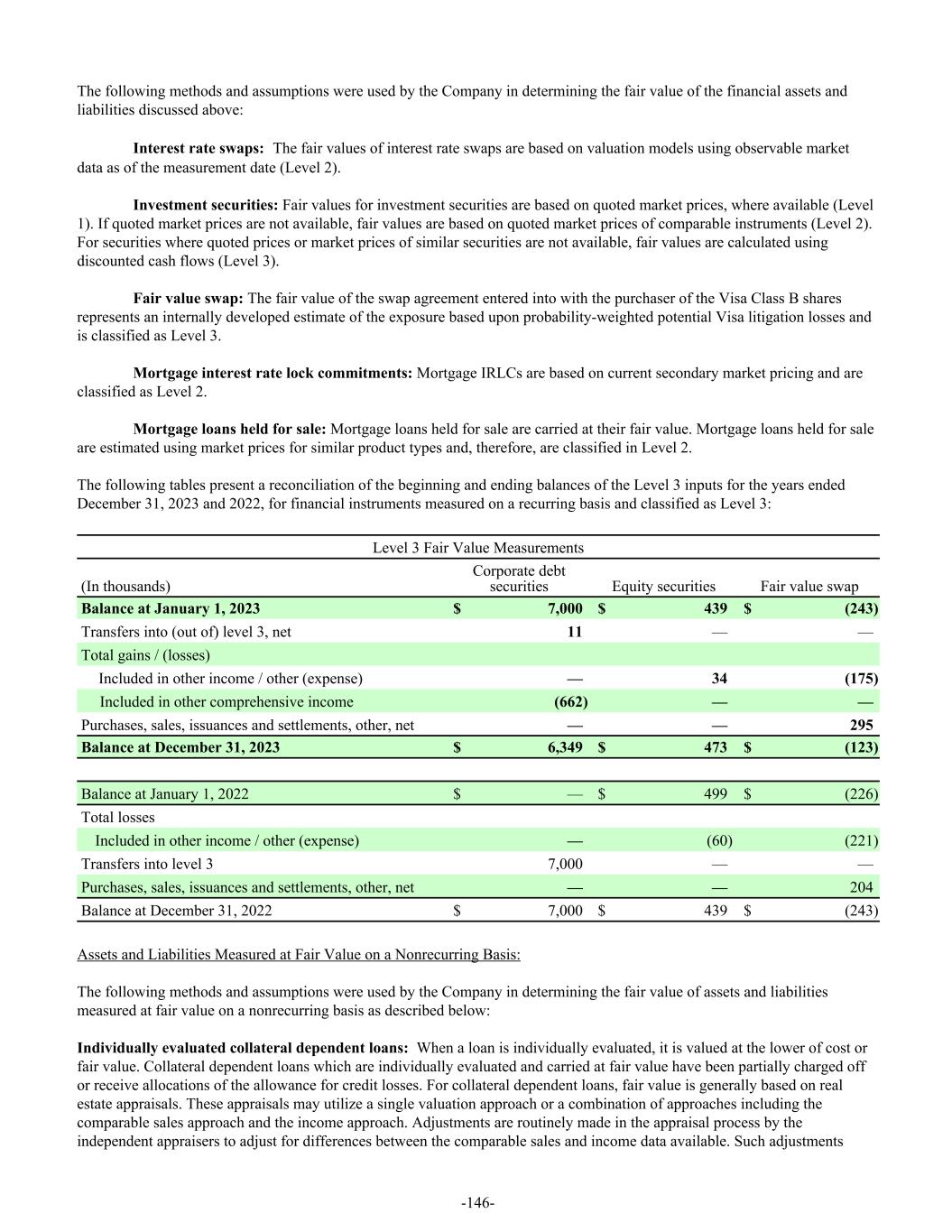 The following methods and assumptions were used by the Company in determining the fair value of the financial assets and liabilities discussed above: Interest rate swaps: The fair values of interest rate swaps are based on valuation models using observable market data as of the measurement date (Level 2). Investment securities: Fair values for investment securities are based on quoted market prices, where available (Level 1). If quoted market prices are not available, fair values are based on quoted market prices of comparable instruments (Level 2). For securities where quoted prices or market prices of similar securities are not available, fair values are calculated using discounted cash flows (Level 3). Fair value swap: The fair value of the swap agreement entered into with the purchaser of the Visa Class B shares represents an internally developed estimate of the exposure based upon probability-weighted potential Visa litigation losses and is classified as Level 3. Mortgage interest rate lock commitments: Mortgage IRLCs are based on current secondary market pricing and are classified as Level 2. Mortgage loans held for sale: Mortgage loans held for sale are carried at their fair value. Mortgage loans held for sale are estimated using market prices for similar product types and, therefore, are classified in Level 2. The following tables present a reconciliation of the beginning and ending balances of the Level 3 inputs for the years ended December 31, 2023 and 2022, for financial instruments measured on a recurring basis and classified as Level 3: Level 3 Fair Value Measurements (In thousands) Corporate debt securities Equity securities Fair value swap Balance at January 1, 2023 $ 7,000 $ 439 $ (243) Transfers into (out of) level 3, net 11 — — Total gains / (losses) Included in other income / other (expense) — 34 (175) Included in other comprehensive income (662) — — Purchases, sales, issuances and settlements, other, net — — 295 Balance at December 31, 2023 $ 6,349 $ 473 $ (123) Balance at January 1, 2022 $ — $ 499 $ (226) Total losses Included in other income / other (expense) — (60) (221) Transfers into level 3 7,000 — — Purchases, sales, issuances and settlements, other, net — — 204 Balance at December 31, 2022 $ 7,000 $ 439 $ (243) Assets and Liabilities Measured at Fair Value on a Nonrecurring Basis: The following methods and assumptions were used by the Company in determining the fair value of assets and liabilities measured at fair value on a nonrecurring basis as described below: Individually evaluated collateral dependent loans: When a loan is individually evaluated, it is valued at the lower of cost or fair value. Collateral dependent loans which are individually evaluated and carried at fair value have been partially charged off or receive allocations of the allowance for credit losses. For collateral dependent loans, fair value is generally based on real estate appraisals. These appraisals may utilize a single valuation approach or a combination of approaches including the comparable sales approach and the income approach. Adjustments are routinely made in the appraisal process by the independent appraisers to adjust for differences between the comparable sales and income data available. Such adjustments -146-