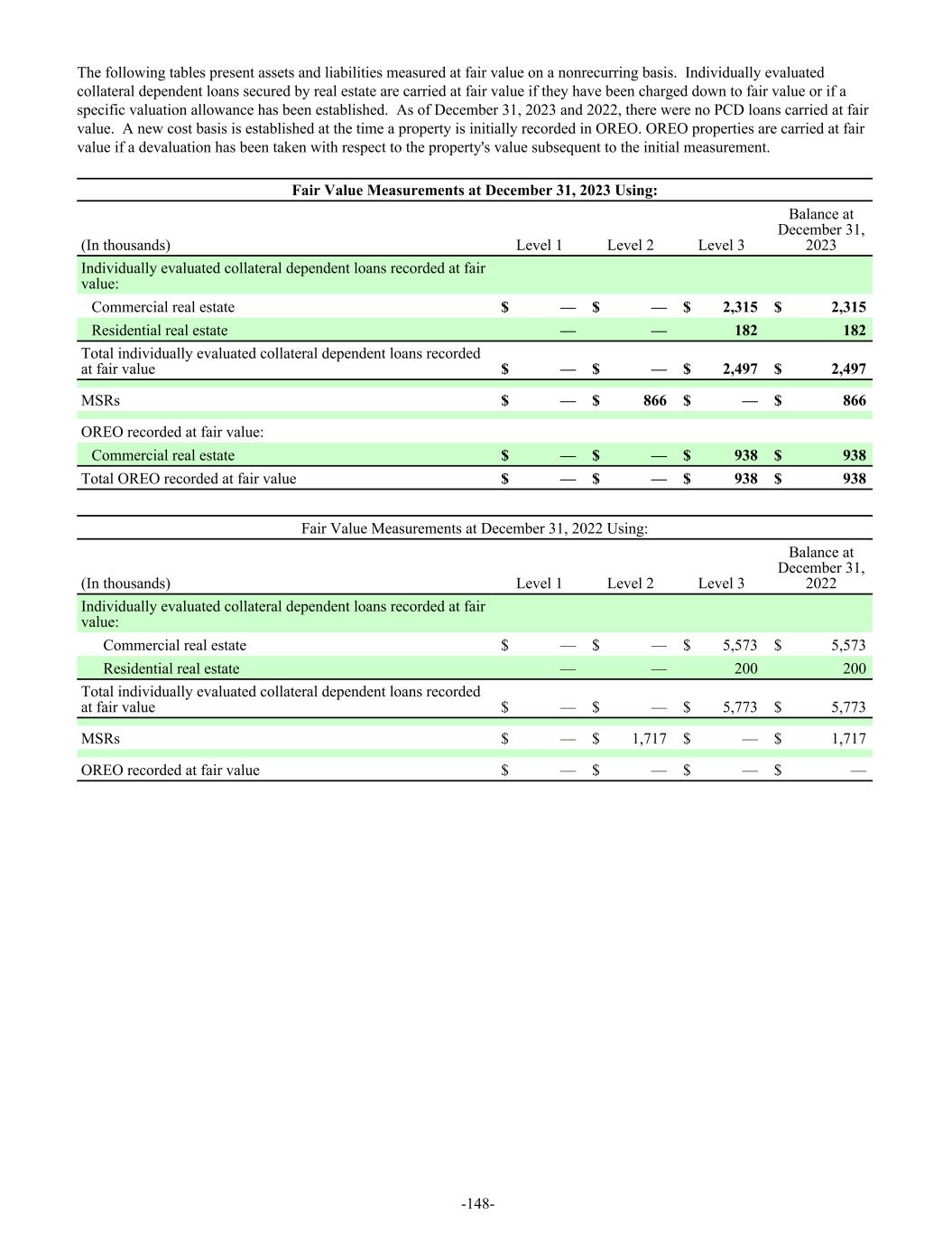 The following tables present assets and liabilities measured at fair value on a nonrecurring basis. Individually evaluated collateral dependent loans secured by real estate are carried at fair value if they have been charged down to fair value or if a specific valuation allowance has been established. As of December 31, 2023 and 2022, there were no PCD loans carried at fair value. A new cost basis is established at the time a property is initially recorded in OREO. OREO properties are carried at fair value if a devaluation has been taken with respect to the property's value subsequent to the initial measurement. Fair Value Measurements at December 31, 2023 Using: (In thousands) Level 1 Level 2 Level 3 Balance at December 31, 2023 Individually evaluated collateral dependent loans recorded at fair value: Commercial real estate $ — $ — $ 2,315 $ 2,315 Residential real estate — — 182 182 Total individually evaluated collateral dependent loans recorded at fair value $ — $ — $ 2,497 $ 2,497 MSRs $ — $ 866 $ — $ 866 OREO recorded at fair value: Commercial real estate $ — $ — $ 938 $ 938 Total OREO recorded at fair value $ — $ — $ 938 $ 938 Fair Value Measurements at December 31, 2022 Using: (In thousands) Level 1 Level 2 Level 3 Balance at December 31, 2022 Individually evaluated collateral dependent loans recorded at fair value: Commercial real estate $ — $ — $ 5,573 $ 5,573 Residential real estate — — 200 200 Total individually evaluated collateral dependent loans recorded at fair value $ — $ — $ 5,773 $ 5,773 MSRs $ — $ 1,717 $ — $ 1,717 OREO recorded at fair value $ — $ — $ — $ — -148-