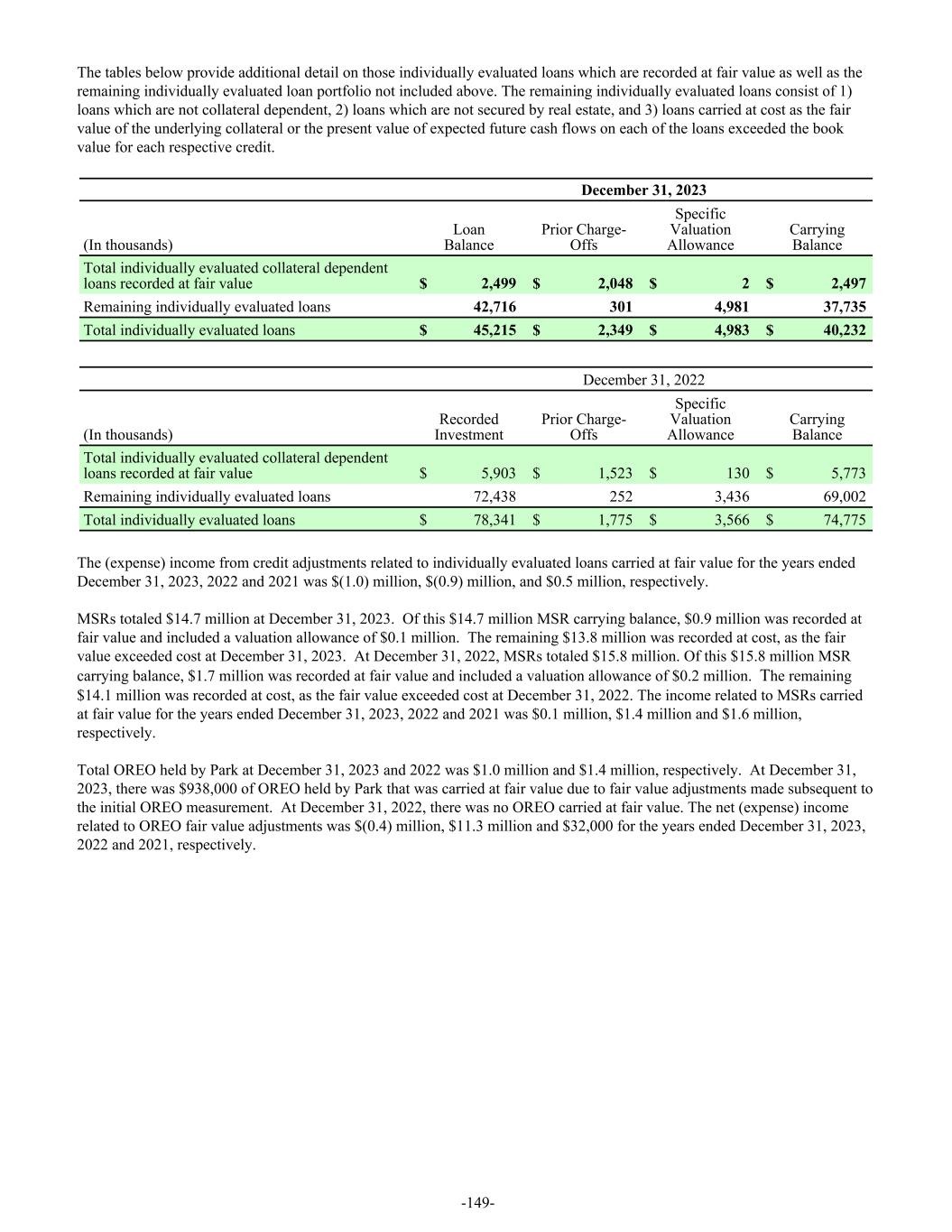 The tables below provide additional detail on those individually evaluated loans which are recorded at fair value as well as the remaining individually evaluated loan portfolio not included above. The remaining individually evaluated loans consist of 1) loans which are not collateral dependent, 2) loans which are not secured by real estate, and 3) loans carried at cost as the fair value of the underlying collateral or the present value of expected future cash flows on each of the loans exceeded the book value for each respective credit. December 31, 2023 (In thousands) Loan Balance Prior Charge- Offs Specific Valuation Allowance Carrying Balance Total individually evaluated collateral dependent loans recorded at fair value $ 2,499 $ 2,048 $ 2 $ 2,497 Remaining individually evaluated loans 42,716 301 4,981 37,735 Total individually evaluated loans $ 45,215 $ 2,349 $ 4,983 $ 40,232 December 31, 2022 (In thousands) Recorded Investment Prior Charge- Offs Specific Valuation Allowance Carrying Balance Total individually evaluated collateral dependent loans recorded at fair value $ 5,903 $ 1,523 $ 130 $ 5,773 Remaining individually evaluated loans 72,438 252 3,436 69,002 Total individually evaluated loans $ 78,341 $ 1,775 $ 3,566 $ 74,775 The (expense) income from credit adjustments related to individually evaluated loans carried at fair value for the years ended December 31, 2023, 2022 and 2021 was $(1.0) million, $(0.9) million, and $0.5 million, respectively. MSRs totaled $14.7 million at December 31, 2023. Of this $14.7 million MSR carrying balance, $0.9 million was recorded at fair value and included a valuation allowance of $0.1 million. The remaining $13.8 million was recorded at cost, as the fair value exceeded cost at December 31, 2023. At December 31, 2022, MSRs totaled $15.8 million. Of this $15.8 million MSR carrying balance, $1.7 million was recorded at fair value and included a valuation allowance of $0.2 million. The remaining $14.1 million was recorded at cost, as the fair value exceeded cost at December 31, 2022. The income related to MSRs carried at fair value for the years ended December 31, 2023, 2022 and 2021 was $0.1 million, $1.4 million and $1.6 million, respectively. Total OREO held by Park at December 31, 2023 and 2022 was $1.0 million and $1.4 million, respectively. At December 31, 2023, there was $938,000 of OREO held by Park that was carried at fair value due to fair value adjustments made subsequent to the initial OREO measurement. At December 31, 2022, there was no OREO carried at fair value. The net (expense) income related to OREO fair value adjustments was $(0.4) million, $11.3 million and $32,000 for the years ended December 31, 2023, 2022 and 2021, respectively. -149-