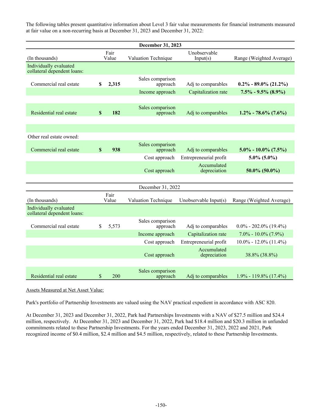 The following tables present quantitative information about Level 3 fair value measurements for financial instruments measured at fair value on a non-recurring basis at December 31, 2023 and December 31, 2022: December 31, 2023 (In thousands) Fair Value Valuation Technique Unobservable Input(s) Range (Weighted Average) Individually evaluated collateral dependent loans: Commercial real estate $ 2,315 Sales comparison approach Adj to comparables 0.2% - 89.0% (21.2%) Income approach Capitalization rate 7.5% - 9.5% (8.9%) Residential real estate $ 182 Sales comparison approach Adj to comparables 1.2% - 78.6% (7.6%) Other real estate owned: Commercial real estate $ 938 Sales comparison approach Adj to comparables 5.0% - 10.0% (7.5%) Cost approach Entrepreneurial profit 5.0% (5.0%) Cost approach Accumulated depreciation 50.0% (50.0%) December 31, 2022 (In thousands) Fair Value Valuation Technique Unobservable Input(s) Range (Weighted Average) Individually evaluated collateral dependent loans: Commercial real estate $ 5,573 Sales comparison approach Adj to comparables 0.0% - 202.0% (19.4%) Income approach Capitalization rate 7.0% - 10.0% (7.9%) Cost approach Entrepreneurial profit 10.0% - 12.0% (11.4%) Cost approach Accumulated depreciation 38.8% (38.8%) Residential real estate $ 200 Sales comparison approach Adj to comparables 1.9% - 119.8% (17.4%) Assets Measured at Net Asset Value: Park's portfolio of Partnership Investments are valued using the NAV practical expedient in accordance with ASC 820. At December 31, 2023 and December 31, 2022, Park had Partnerships Investments with a NAV of $27.5 million and $24.4 million, respectively. At December 31, 2023 and December 31, 2022, Park had $18.4 million and $20.3 million in unfunded commitments related to these Partnership Investments. For the years ended December 31, 2023, 2022 and 2021, Park recognized income of $0.4 million, $2.4 million and $4.5 million, respectively, related to these Partnership Investments. -150-