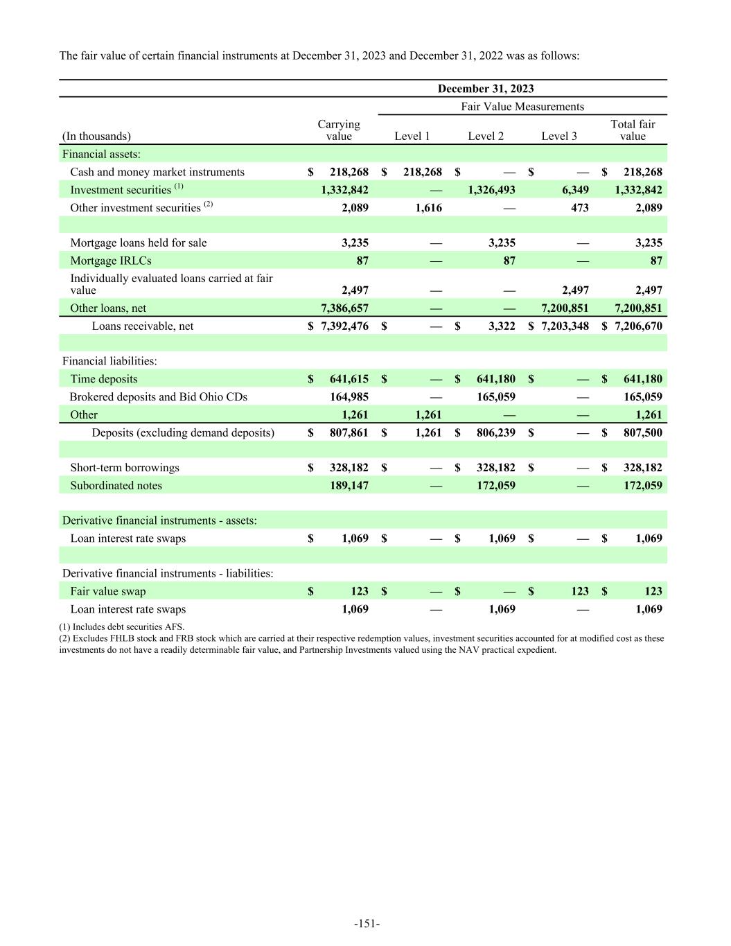 The fair value of certain financial instruments at December 31, 2023 and December 31, 2022 was as follows: December 31, 2023 Fair Value Measurements (In thousands) Carrying value Level 1 Level 2 Level 3 Total fair value Financial assets: Cash and money market instruments $ 218,268 $ 218,268 $ — $ — $ 218,268 Investment securities (1) 1,332,842 — 1,326,493 6,349 1,332,842 Other investment securities (2) 2,089 1,616 — 473 2,089 Mortgage loans held for sale 3,235 — 3,235 — 3,235 Mortgage IRLCs 87 — 87 — 87 Individually evaluated loans carried at fair value 2,497 — — 2,497 2,497 Other loans, net 7,386,657 — — 7,200,851 7,200,851 Loans receivable, net $ 7,392,476 $ — $ 3,322 $ 7,203,348 $ 7,206,670 Financial liabilities: Time deposits $ 641,615 $ — $ 641,180 $ — $ 641,180 Brokered deposits and Bid Ohio CDs 164,985 — 165,059 — 165,059 Other 1,261 1,261 — — 1,261 Deposits (excluding demand deposits) $ 807,861 $ 1,261 $ 806,239 $ — $ 807,500 Short-term borrowings $ 328,182 $ — $ 328,182 $ — $ 328,182 Subordinated notes 189,147 — 172,059 — 172,059 Derivative financial instruments - assets: Loan interest rate swaps $ 1,069 $ — $ 1,069 $ — $ 1,069 Derivative financial instruments - liabilities: Fair value swap $ 123 $ — $ — $ 123 $ 123 Loan interest rate swaps 1,069 — 1,069 — 1,069 (1) Includes debt securities AFS. (2) Excludes FHLB stock and FRB stock which are carried at their respective redemption values, investment securities accounted for at modified cost as these investments do not have a readily determinable fair value, and Partnership Investments valued using the NAV practical expedient. -151-