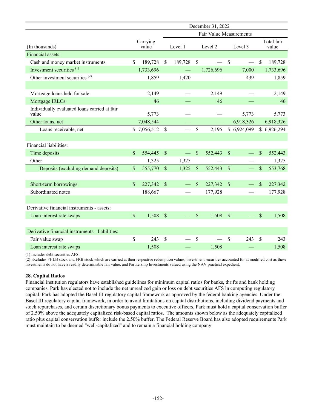 December 31, 2022 Fair Value Measurements (In thousands) Carrying value Level 1 Level 2 Level 3 Total fair value Financial assets: Cash and money market instruments $ 189,728 $ 189,728 $ — $ — $ 189,728 Investment securities (1) 1,733,696 — 1,726,696 7,000 1,733,696 Other investment securities (2) 1,859 1,420 — 439 1,859 Mortgage loans held for sale 2,149 — 2,149 — 2,149 Mortgage IRLCs 46 — 46 — 46 Individually evaluated loans carried at fair value 5,773 — — 5,773 5,773 Other loans, net 7,048,544 — — 6,918,326 6,918,326 Loans receivable, net $ 7,056,512 $ — $ 2,195 $ 6,924,099 $ 6,926,294 Financial liabilities: Time deposits $ 554,445 $ — $ 552,443 $ — $ 552,443 Other 1,325 1,325 — — 1,325 Deposits (excluding demand deposits) $ 555,770 $ 1,325 $ 552,443 $ — $ 553,768 Short-term borrowings $ 227,342 $ — $ 227,342 $ — $ 227,342 Subordinated notes 188,667 — 177,928 — 177,928 Derivative financial instruments - assets: Loan interest rate swaps $ 1,508 $ — $ 1,508 $ — $ 1,508 Derivative financial instruments - liabilities: Fair value swap $ 243 $ — $ — $ 243 $ 243 Loan interest rate swaps 1,508 — 1,508 — 1,508 (1) Includes debt securities AFS. (2) Excludes FHLB stock and FRB stock which are carried at their respective redemption values, investment securities accounted for at modified cost as these investments do not have a readily determinable fair value, and Partnership Investments valued using the NAV practical expedient. 28. Capital Ratios Financial institution regulators have established guidelines for minimum capital ratios for banks, thrifts and bank holding companies. Park has elected not to include the net unrealized gain or loss on debt securities AFS in computing regulatory capital. Park has adopted the Basel III regulatory capital framework as approved by the federal banking agencies. Under the Basel III regulatory capital framework, in order to avoid limitations on capital distributions, including dividend payments and stock repurchases, and certain discretionary bonus payments to executive officers, Park must hold a capital conservation buffer of 2.50% above the adequately capitalized risk-based capital ratios. The amounts shown below as the adequately capitalized ratio plus capital conservation buffer include the 2.50% buffer. The Federal Reserve Board has also adopted requirements Park must maintain to be deemed "well-capitalized" and to remain a financial holding company. -152-