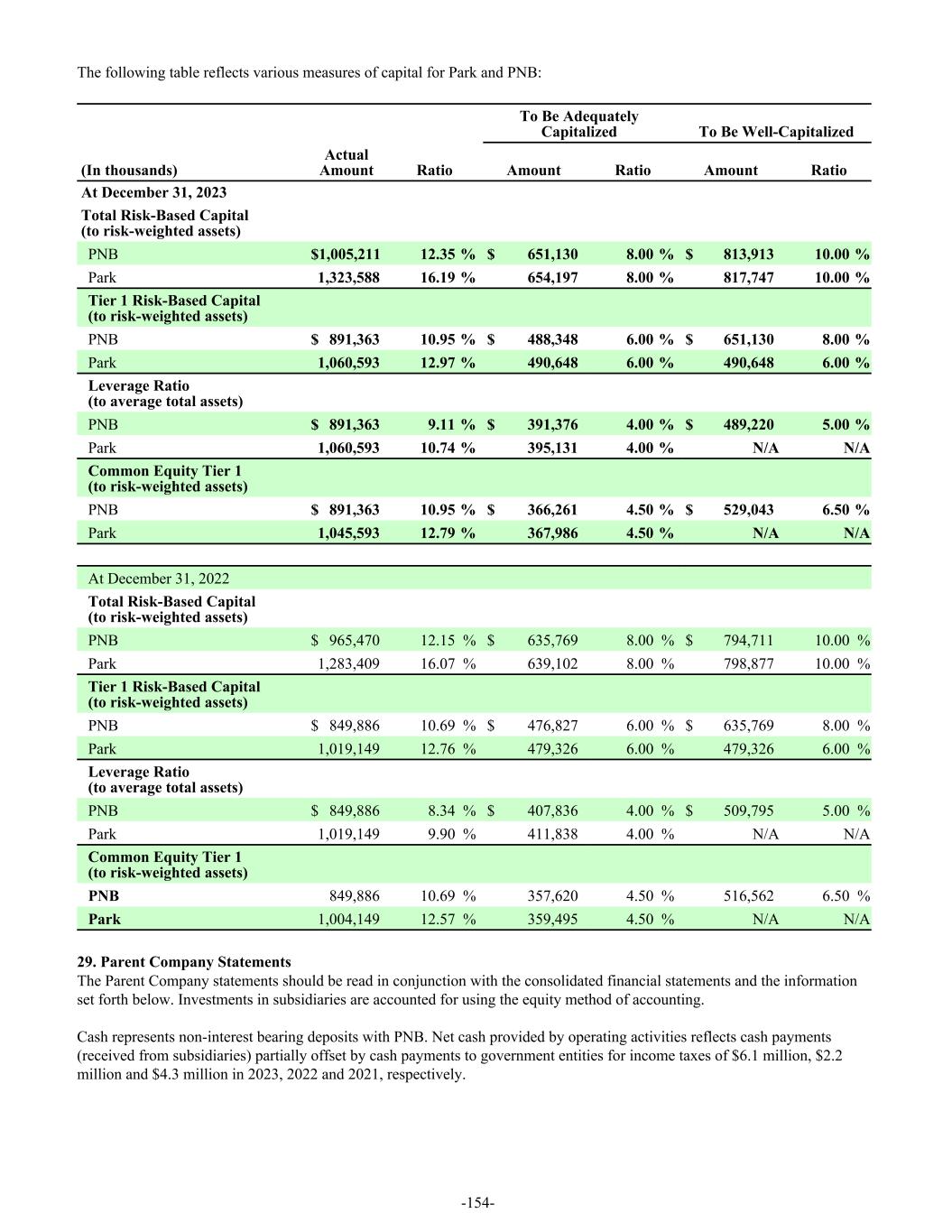 The following table reflects various measures of capital for Park and PNB: To Be Adequately Capitalized To Be Well-Capitalized (In thousands) Actual Amount Ratio Amount Ratio Amount Ratio At December 31, 2023 Total Risk-Based Capital (to risk-weighted assets) PNB $ 1,005,211 12.35 % $ 651,130 8.00 % $ 813,913 10.00 % Park 1,323,588 16.19 % 654,197 8.00 % 817,747 10.00 % Tier 1 Risk-Based Capital (to risk-weighted assets) PNB $ 891,363 10.95 % $ 488,348 6.00 % $ 651,130 8.00 % Park 1,060,593 12.97 % 490,648 6.00 % 490,648 6.00 % Leverage Ratio (to average total assets) PNB $ 891,363 9.11 % $ 391,376 4.00 % $ 489,220 5.00 % Park 1,060,593 10.74 % 395,131 4.00 % N/A N/A Common Equity Tier 1 (to risk-weighted assets) PNB $ 891,363 10.95 % $ 366,261 4.50 % $ 529,043 6.50 % Park 1,045,593 12.79 % 367,986 4.50 % N/A N/A At December 31, 2022 Total Risk-Based Capital (to risk-weighted assets) PNB $ 965,470 12.15 % $ 635,769 8.00 % $ 794,711 10.00 % Park 1,283,409 16.07 % 639,102 8.00 % 798,877 10.00 % Tier 1 Risk-Based Capital (to risk-weighted assets) PNB $ 849,886 10.69 % $ 476,827 6.00 % $ 635,769 8.00 % Park 1,019,149 12.76 % 479,326 6.00 % 479,326 6.00 % Leverage Ratio (to average total assets) PNB $ 849,886 8.34 % $ 407,836 4.00 % $ 509,795 5.00 % Park 1,019,149 9.90 % 411,838 4.00 % N/A N/A Common Equity Tier 1 (to risk-weighted assets) PNB 849,886 10.69 % 357,620 4.50 % 516,562 6.50 % Park 1,004,149 12.57 % 359,495 4.50 % N/A N/A 29. Parent Company Statements The Parent Company statements should be read in conjunction with the consolidated financial statements and the information set forth below. Investments in subsidiaries are accounted for using the equity method of accounting. Cash represents non-interest bearing deposits with PNB. Net cash provided by operating activities reflects cash payments (received from subsidiaries) partially offset by cash payments to government entities for income taxes of $6.1 million, $2.2 million and $4.3 million in 2023, 2022 and 2021, respectively. -154-