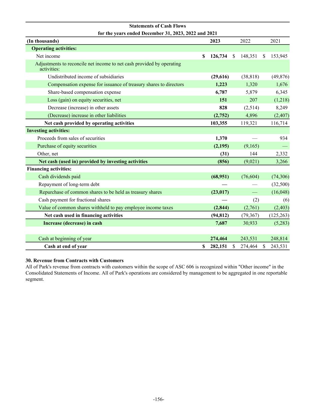 Statements of Cash Flows for the years ended December 31, 2023, 2022 and 2021 (In thousands) 2023 2022 2021 Operating activities: Net income $ 126,734 $ 148,351 $ 153,945 Adjustments to reconcile net income to net cash provided by operating activities: Undistributed income of subsidiaries (29,616) (38,818) (49,876) Compensation expense for issuance of treasury shares to directors 1,223 1,320 1,676 Share-based compensation expense 6,787 5,879 6,345 Loss (gain) on equity securities, net 151 207 (1,218) Decrease (increase) in other assets 828 (2,514) 8,249 (Decrease) increase in other liabilities (2,752) 4,896 (2,407) Net cash provided by operating activities 103,355 119,321 116,714 Investing activities: Proceeds from sales of securities 1,370 — 934 Purchase of equity securities (2,195) (9,165) — Other, net (31) 144 2,332 Net cash (used in) provided by investing activities (856) (9,021) 3,266 Financing activities: Cash dividends paid (68,951) (76,604) (74,306) Repayment of long-term debt — — (32,500) Repurchase of common shares to be held as treasury shares (23,017) — (16,048) Cash payment for fractional shares — (2) (6) Value of common shares withheld to pay employee income taxes (2,844) (2,761) (2,403) Net cash used in financing activities (94,812) (79,367) (125,263) Increase (decrease) in cash 7,687 30,933 (5,283) Cash at beginning of year 274,464 243,531 248,814 Cash at end of year $ 282,151 $ 274,464 $ 243,531 30. Revenue from Contracts with Customers All of Park's revenue from contracts with customers within the scope of ASC 606 is recognized within "Other income" in the Consolidated Statements of Income. All of Park's operations are considered by management to be aggregated in one reportable segment. -156-
