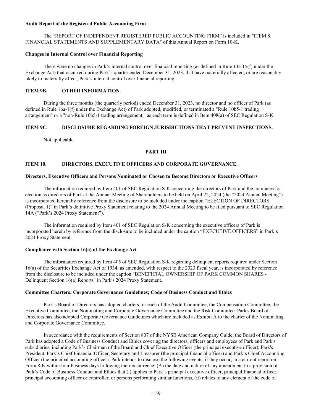 Audit Report of the Registered Public Accounting Firm The “REPORT OF INDEPENDENT REGISTERED PUBLIC ACCOUNTING FIRM” is included in "ITEM 8. FINANCIAL STATEMENTS AND SUPPLEMENTARY DATA" of this Annual Report on Form 10-K. Changes in Internal Control over Financial Reporting There were no changes in Park’s internal control over financial reporting (as defined in Rule 13a-15(f) under the Exchange Act) that occurred during Park’s quarter ended December 31, 2023, that have materially affected, or are reasonably likely to materially affect, Park’s internal control over financial reporting. ITEM 9B. OTHER INFORMATION. During the three months (the quarterly period) ended December 31, 2023, no director and no officer of Park (as defined in Rule 16a-1(f) under the Exchange Act) of Park adopted, modified, or terminated a "Rule 10b5-1 trading arrangement" or a "non-Rule 10b5-1 trading arrangement," as each term is defined in Item 408(a) of SEC Regulation S-K. ITEM 9C. DISCLOSURE REGARDING FOREIGN JURISDICTIONS THAT PREVENT INSPECTIONS. Not applicable. PART III ITEM 10. DIRECTORS, EXECUTIVE OFFICERS AND CORPORATE GOVERNANCE. Directors, Executive Officers and Persons Nominated or Chosen to Become Directors or Executive Officers The information required by Item 401 of SEC Regulation S-K concerning the directors of Park and the nominees for election as directors of Park at the Annual Meeting of Shareholders to be held on April 22, 2024 (the “2024 Annual Meeting”) is incorporated herein by reference from the disclosure to be included under the caption “ELECTION OF DIRECTORS (Proposal 1)” in Park’s definitive Proxy Statement relating to the 2024 Annual Meeting to be filed pursuant to SEC Regulation 14A (“Park’s 2024 Proxy Statement”). The information required by Item 401 of SEC Regulation S-K concerning the executive officers of Park is incorporated herein by reference from the disclosure to be included under the caption “EXECUTIVE OFFICERS” in Park’s 2024 Proxy Statement. Compliance with Section 16(a) of the Exchange Act The information required by Item 405 of SEC Regulation S-K regarding delinquent reports required under Section 16(a) of the Securities Exchange Act of 1934, as amended, with respect to the 2023 fiscal year, is incorporated by reference from the disclosure to be included under the caption "BENEFICIAL OWNERSHIP OF PARK COMMON SHARES - Delinquent Section 16(a) Reports" in Park's 2024 Proxy Statement. Committee Charters; Corporate Governance Guidelines; Code of Business Conduct and Ethics Park’s Board of Directors has adopted charters for each of the Audit Committee, the Compensation Committee, the Executive Committee, the Nominating and Corporate Governance Committee and the Risk Committee. Park's Board of Directors has also adopted Corporate Governance Guidelines which are included as Exhibit A to the charter of the Nominating and Corporate Governance Committee. In accordance with the requirements of Section 807 of the NYSE American Company Guide, the Board of Directors of Park has adopted a Code of Business Conduct and Ethics covering the directors, officers and employees of Park and Park's subsidiaries, including Park’s Chairman of the Board and Chief Executive Officer (the principal executive officer), Park's President, Park’s Chief Financial Officer, Secretary and Treasurer (the principal financial officer) and Park’s Chief Accounting Officer (the principal accounting officer). Park intends to disclose the following events, if they occur, in a current report on Form 8-K within four business days following their occurrence: (A) the date and nature of any amendment to a provision of Park’s Code of Business Conduct and Ethics that (i) applies to Park’s principal executive officer, principal financial officer, principal accounting officer or controller, or persons performing similar functions, (ii) relates to any element of the code of -159-