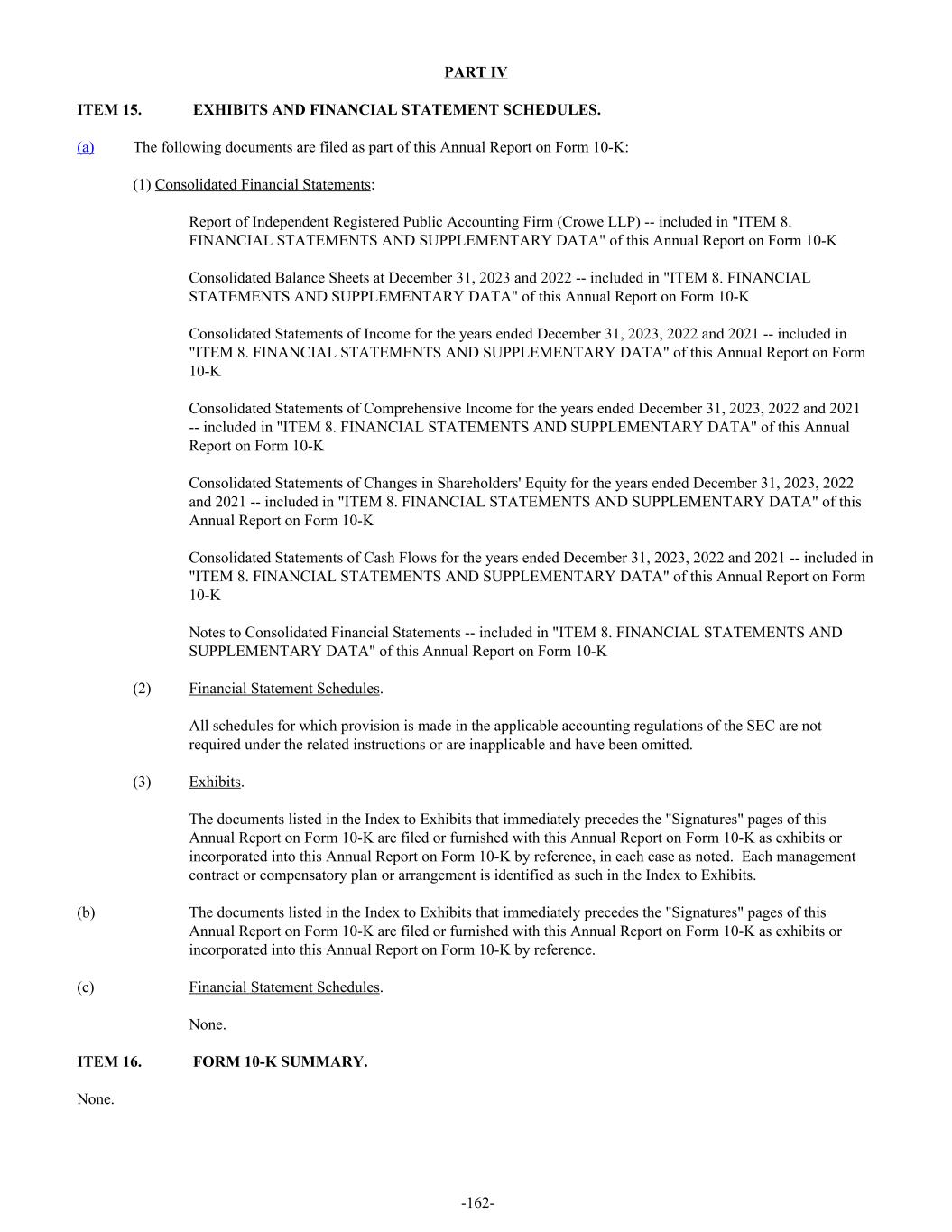 PART IV ITEM 15. EXHIBITS AND FINANCIAL STATEMENT SCHEDULES. (a) The following documents are filed as part of this Annual Report on Form 10-K: (1) Consolidated Financial Statements: Report of Independent Registered Public Accounting Firm (Crowe LLP) -- included in "ITEM 8. FINANCIAL STATEMENTS AND SUPPLEMENTARY DATA" of this Annual Report on Form 10-K Consolidated Balance Sheets at December 31, 2023 and 2022 -- included in "ITEM 8. FINANCIAL STATEMENTS AND SUPPLEMENTARY DATA" of this Annual Report on Form 10-K Consolidated Statements of Income for the years ended December 31, 2023, 2022 and 2021 -- included in "ITEM 8. FINANCIAL STATEMENTS AND SUPPLEMENTARY DATA" of this Annual Report on Form 10-K Consolidated Statements of Comprehensive Income for the years ended December 31, 2023, 2022 and 2021 -- included in "ITEM 8. FINANCIAL STATEMENTS AND SUPPLEMENTARY DATA" of this Annual Report on Form 10-K Consolidated Statements of Changes in Shareholders' Equity for the years ended December 31, 2023, 2022 and 2021 -- included in "ITEM 8. FINANCIAL STATEMENTS AND SUPPLEMENTARY DATA" of this Annual Report on Form 10-K Consolidated Statements of Cash Flows for the years ended December 31, 2023, 2022 and 2021 -- included in "ITEM 8. FINANCIAL STATEMENTS AND SUPPLEMENTARY DATA" of this Annual Report on Form 10-K Notes to Consolidated Financial Statements -- included in "ITEM 8. FINANCIAL STATEMENTS AND SUPPLEMENTARY DATA" of this Annual Report on Form 10-K (2) Financial Statement Schedules. All schedules for which provision is made in the applicable accounting regulations of the SEC are not required under the related instructions or are inapplicable and have been omitted. (3) Exhibits. The documents listed in the Index to Exhibits that immediately precedes the "Signatures" pages of this Annual Report on Form 10-K are filed or furnished with this Annual Report on Form 10-K as exhibits or incorporated into this Annual Report on Form 10-K by reference, in each case as noted. Each management contract or compensatory plan or arrangement is identified as such in the Index to Exhibits. (b) The documents listed in the Index to Exhibits that immediately precedes the "Signatures" pages of this Annual Report on Form 10-K are filed or furnished with this Annual Report on Form 10-K as exhibits or incorporated into this Annual Report on Form 10-K by reference. (c) Financial Statement Schedules. None. ITEM 16. FORM 10-K SUMMARY. None. -162-