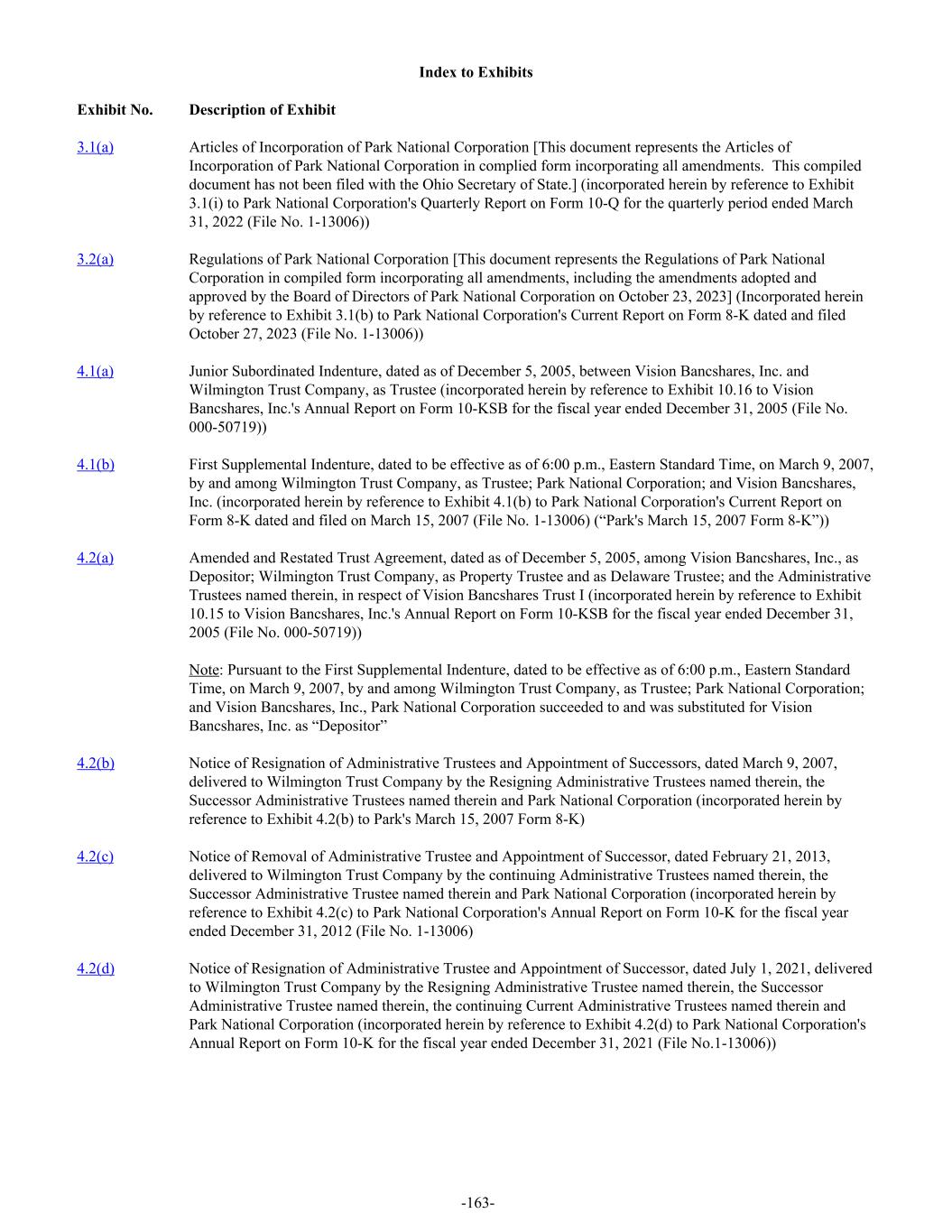 Index to Exhibits Exhibit No. Description of Exhibit 3.1(a) Articles of Incorporation of Park National Corporation [This document represents the Articles of Incorporation of Park National Corporation in complied form incorporating all amendments. This compiled document has not been filed with the Ohio Secretary of State.] (incorporated herein by reference to Exhibit 3.1(i) to Park National Corporation's Quarterly Report on Form 10-Q for the quarterly period ended March 31, 2022 (File No. 1-13006)) 3.2(a) Regulations of Park National Corporation [This document represents the Regulations of Park National Corporation in compiled form incorporating all amendments, including the amendments adopted and approved by the Board of Directors of Park National Corporation on October 23, 2023] (Incorporated herein by reference to Exhibit 3.1(b) to Park National Corporation's Current Report on Form 8-K dated and filed October 27, 2023 (File No. 1-13006)) 4.1(a) Junior Subordinated Indenture, dated as of December 5, 2005, between Vision Bancshares, Inc. and Wilmington Trust Company, as Trustee (incorporated herein by reference to Exhibit 10.16 to Vision Bancshares, Inc.'s Annual Report on Form 10-KSB for the fiscal year ended December 31, 2005 (File No. 000-50719)) 4.1(b) First Supplemental Indenture, dated to be effective as of 6:00 p.m., Eastern Standard Time, on March 9, 2007, by and among Wilmington Trust Company, as Trustee; Park National Corporation; and Vision Bancshares, Inc. (incorporated herein by reference to Exhibit 4.1(b) to Park National Corporation's Current Report on Form 8-K dated and filed on March 15, 2007 (File No. 1-13006) (“Park's March 15, 2007 Form 8-K”)) 4.2(a) Amended and Restated Trust Agreement, dated as of December 5, 2005, among Vision Bancshares, Inc., as Depositor; Wilmington Trust Company, as Property Trustee and as Delaware Trustee; and the Administrative Trustees named therein, in respect of Vision Bancshares Trust I (incorporated herein by reference to Exhibit 10.15 to Vision Bancshares, Inc.'s Annual Report on Form 10-KSB for the fiscal year ended December 31, 2005 (File No. 000-50719)) Note: Pursuant to the First Supplemental Indenture, dated to be effective as of 6:00 p.m., Eastern Standard Time, on March 9, 2007, by and among Wilmington Trust Company, as Trustee; Park National Corporation; and Vision Bancshares, Inc., Park National Corporation succeeded to and was substituted for Vision Bancshares, Inc. as “Depositor” 4.2(b) Notice of Resignation of Administrative Trustees and Appointment of Successors, dated March 9, 2007, delivered to Wilmington Trust Company by the Resigning Administrative Trustees named therein, the Successor Administrative Trustees named therein and Park National Corporation (incorporated herein by reference to Exhibit 4.2(b) to Park's March 15, 2007 Form 8-K) 4.2(c) Notice of Removal of Administrative Trustee and Appointment of Successor, dated February 21, 2013, delivered to Wilmington Trust Company by the continuing Administrative Trustees named therein, the Successor Administrative Trustee named therein and Park National Corporation (incorporated herein by reference to Exhibit 4.2(c) to Park National Corporation's Annual Report on Form 10-K for the fiscal year ended December 31, 2012 (File No. 1-13006) 4.2(d) Notice of Resignation of Administrative Trustee and Appointment of Successor, dated July 1, 2021, delivered to Wilmington Trust Company by the Resigning Administrative Trustee named therein, the Successor Administrative Trustee named therein, the continuing Current Administrative Trustees named therein and Park National Corporation (incorporated herein by reference to Exhibit 4.2(d) to Park National Corporation's Annual Report on Form 10-K for the fiscal year ended December 31, 2021 (File No.1-13006)) -163-