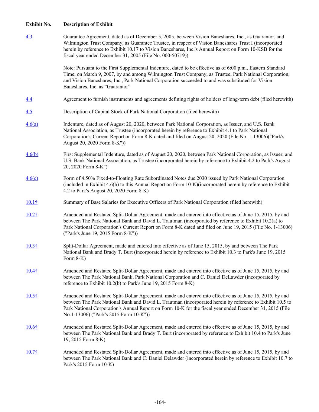 Exhibit No. Description of Exhibit 4.3 Guarantee Agreement, dated as of December 5, 2005, between Vision Bancshares, Inc., as Guarantor, and Wilmington Trust Company, as Guarantee Trustee, in respect of Vision Bancshares Trust I (incorporated herein by reference to Exhibit 10.17 to Vision Bancshares, Inc.'s Annual Report on Form 10-KSB for the fiscal year ended December 31, 2005 (File No. 000-50719)) Note: Pursuant to the First Supplemental Indenture, dated to be effective as of 6:00 p.m., Eastern Standard Time, on March 9, 2007, by and among Wilmington Trust Company, as Trustee; Park National Corporation; and Vision Bancshares, Inc., Park National Corporation succeeded to and was substituted for Vision Bancshares, Inc. as “Guarantor” 4.4 Agreement to furnish instruments and agreements defining rights of holders of long-term debt (filed herewith) 4.5 Description of Capital Stock of Park National Corporation (filed herewith) 4.6(a) Indenture, dated as of August 20, 2020, between Park National Corporation, as Issuer, and U.S. Bank National Association, as Trustee (incorporated herein by reference to Exhibit 4.1 to Park National Corporation's Current Report on Form 8-K dated and filed on August 20, 2020 (File No. 1-13006)("Park's August 20, 2020 Form 8-K")) 4.6(b) First Supplemental Indenture, dated as of August 20, 2020, between Park National Corporation, as Issuer, and U.S. Bank National Association, as Trustee (incorporated herein by reference to Exhibit 4.2 to Park's August 20, 2020 Form 8-K") 4.6(c) Form of 4.50% Fixed-to-Floating Rate Subordinated Notes due 2030 issued by Park National Corporation (included in Exhibit 4.6(b) to this Annual Report on Form 10-K)(incorporated herein by reference to Exhibit 4.2 to Park's August 20, 2020 Form 8-K) 10.1† Summary of Base Salaries for Executive Officers of Park National Corporation (filed herewith) 10.2† Amended and Restated Split-Dollar Agreement, made and entered into effective as of June 15, 2015, by and between The Park National Bank and David L. Trautman (incorporated by reference to Exhibit 10.2(a) to Park National Corporation's Current Report on Form 8-K dated and filed on June 19, 2015 (File No. 1-13006) ("Park's June 19, 2015 Form 8-K")) 10.3† Split-Dollar Agreement, made and entered into effective as of June 15, 2015, by and between The Park National Bank and Brady T. Burt (incorporated herein by reference to Exhibit 10.3 to Park's June 19, 2015 Form 8-K) 10.4† Amended and Restated Split-Dollar Agreement, made and entered into effective as of June 15, 2015, by and between The Park National Bank, Park National Corporation and C. Daniel DeLawder (incorporated by reference to Exhibit 10.2(b) to Park's June 19, 2015 Form 8-K) 10.5† Amended and Restated Split-Dollar Agreement, made and entered into effective as of June 15, 2015, by and between The Park National Bank and David L. Trautman (incorporated herein by reference to Exhibit 10.5 to Park National Corporation's Annual Report on Form 10-K for the fiscal year ended December 31, 2015 (File No.1-13006) ("Park's 2015 Form 10-K")) 10.6† Amended and Restated Split-Dollar Agreement, made and entered into effective as of June 15, 2015, by and between The Park National Bank and Brady T. Burt (incorporated by reference to Exhibit 10.4 to Park's June 19, 2015 Form 8-K) 10.7† Amended and Restated Split-Dollar Agreement, made and entered into effective as of June 15, 2015, by and between The Park National Bank and C. Daniel Delawder (incorporated herein by reference to Exhibit 10.7 to Park's 2015 Form 10-K) -164-