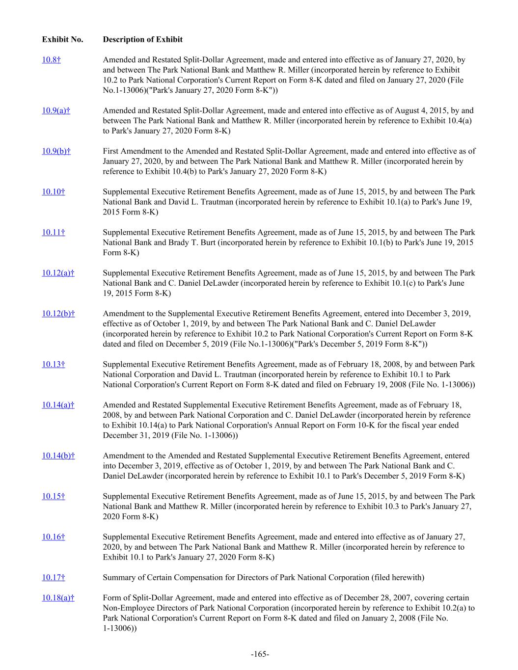 Exhibit No. Description of Exhibit 10.8† Amended and Restated Split-Dollar Agreement, made and entered into effective as of January 27, 2020, by and between The Park National Bank and Matthew R. Miller (incorporated herein by reference to Exhibit 10.2 to Park National Corporation's Current Report on Form 8-K dated and filed on January 27, 2020 (File No.1-13006)("Park's January 27, 2020 Form 8-K")) 10.9(a)† Amended and Restated Split-Dollar Agreement, made and entered into effective as of August 4, 2015, by and between The Park National Bank and Matthew R. Miller (incorporated herein by reference to Exhibit 10.4(a) to Park's January 27, 2020 Form 8-K) 10.9(b)† First Amendment to the Amended and Restated Split-Dollar Agreement, made and entered into effective as of January 27, 2020, by and between The Park National Bank and Matthew R. Miller (incorporated herein by reference to Exhibit 10.4(b) to Park's January 27, 2020 Form 8-K) 10.10† Supplemental Executive Retirement Benefits Agreement, made as of June 15, 2015, by and between The Park National Bank and David L. Trautman (incorporated herein by reference to Exhibit 10.1(a) to Park's June 19, 2015 Form 8-K) 10.11† Supplemental Executive Retirement Benefits Agreement, made as of June 15, 2015, by and between The Park National Bank and Brady T. Burt (incorporated herein by reference to Exhibit 10.1(b) to Park's June 19, 2015 Form 8-K) 10.12(a)† Supplemental Executive Retirement Benefits Agreement, made as of June 15, 2015, by and between The Park National Bank and C. Daniel DeLawder (incorporated herein by reference to Exhibit 10.1(c) to Park's June 19, 2015 Form 8-K) 10.12(b)† Amendment to the Supplemental Executive Retirement Benefits Agreement, entered into December 3, 2019, effective as of October 1, 2019, by and between The Park National Bank and C. Daniel DeLawder (incorporated herein by reference to Exhibit 10.2 to Park National Corporation's Current Report on Form 8-K dated and filed on December 5, 2019 (File No.1-13006)("Park's December 5, 2019 Form 8-K")) 10.13† Supplemental Executive Retirement Benefits Agreement, made as of February 18, 2008, by and between Park National Corporation and David L. Trautman (incorporated herein by reference to Exhibit 10.1 to Park National Corporation's Current Report on Form 8-K dated and filed on February 19, 2008 (File No. 1-13006)) 10.14(a)† Amended and Restated Supplemental Executive Retirement Benefits Agreement, made as of February 18, 2008, by and between Park National Corporation and C. Daniel DeLawder (incorporated herein by reference to Exhibit 10.14(a) to Park National Corporation's Annual Report on Form 10-K for the fiscal year ended December 31, 2019 (File No. 1-13006)) 10.14(b)† Amendment to the Amended and Restated Supplemental Executive Retirement Benefits Agreement, entered into December 3, 2019, effective as of October 1, 2019, by and between The Park National Bank and C. Daniel DeLawder (incorporated herein by reference to Exhibit 10.1 to Park's December 5, 2019 Form 8-K) 10.15† Supplemental Executive Retirement Benefits Agreement, made as of June 15, 2015, by and between The Park National Bank and Matthew R. Miller (incorporated herein by reference to Exhibit 10.3 to Park's January 27, 2020 Form 8-K) 10.16† Supplemental Executive Retirement Benefits Agreement, made and entered into effective as of January 27, 2020, by and between The Park National Bank and Matthew R. Miller (incorporated herein by reference to Exhibit 10.1 to Park's January 27, 2020 Form 8-K) 10.17† Summary of Certain Compensation for Directors of Park National Corporation (filed herewith) 10.18(a)† Form of Split-Dollar Agreement, made and entered into effective as of December 28, 2007, covering certain Non-Employee Directors of Park National Corporation (incorporated herein by reference to Exhibit 10.2(a) to Park National Corporation's Current Report on Form 8-K dated and filed on January 2, 2008 (File No. 1-13006)) -165-