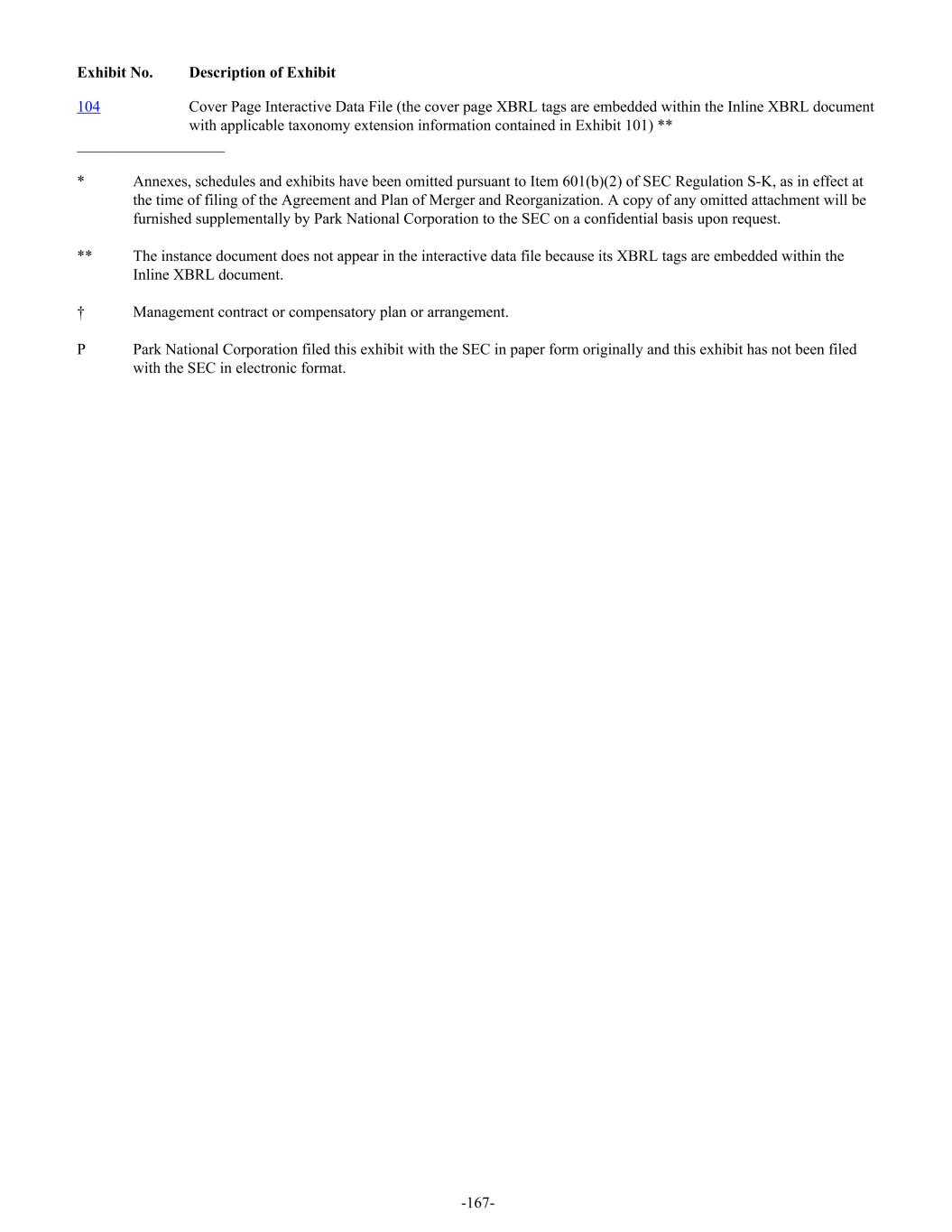 Exhibit No. Description of Exhibit 104 Cover Page Interactive Data File (the cover page XBRL tags are embedded within the Inline XBRL document with applicable taxonomy extension information contained in Exhibit 101) ** ___________________ * Annexes, schedules and exhibits have been omitted pursuant to Item 601(b)(2) of SEC Regulation S-K, as in effect at the time of filing of the Agreement and Plan of Merger and Reorganization. A copy of any omitted attachment will be furnished supplementally by Park National Corporation to the SEC on a confidential basis upon request. ** The instance document does not appear in the interactive data file because its XBRL tags are embedded within the Inline XBRL document. † Management contract or compensatory plan or arrangement. P Park National Corporation filed this exhibit with the SEC in paper form originally and this exhibit has not been filed with the SEC in electronic format. -167-