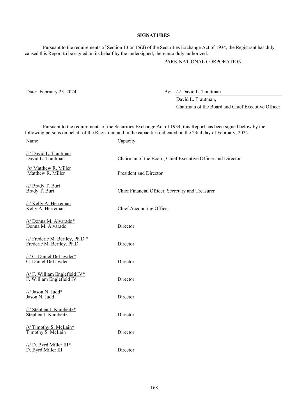 SIGNATURES Pursuant to the requirements of Section 13 or 15(d) of the Securities Exchange Act of 1934, the Registrant has duly caused this Report to be signed on its behalf by the undersigned, thereunto duly authorized. PARK NATIONAL CORPORATION Date: February 23, 2024 By: /s/ David L. Trautman David L. Trautman, Chairman of the Board and Chief Executive Officer Pursuant to the requirements of the Securities Exchange Act of 1934, this Report has been signed below by the following persons on behalf of the Registrant and in the capacities indicated on the 23nd day of February, 2024. Name Capacity /s/ David L. Trautman David L. Trautman Chairman of the Board, Chief Executive Officer and Director /s/ Matthew R. Miller Matthew R. Miller President and Director /s/ Brady T. Burt Brady T. Burt Chief Financial Officer, Secretary and Treasurer /s/ Kelly A. Herreman Kelly A. Herreman Chief Accounting Officer /s/ Donna M. Alvarado* Donna M. Alvarado Director /s/ Frederic M. Bertley, Ph.D.* Frederic M. Bertley, Ph.D. Director /s/ C. Daniel DeLawder* C. Daniel DeLawder Director /s/ F. William Englefield IV* F. William Englefield IV Director /s/ Jason N. Judd* Jason N. Judd Director /s/ Stephen J. Kambeitz* Stephen J. Kambeitz Director /s/ Timothy S. McLain* Timothy S. McLain Director /s/ D. Byrd Miller III* D. Byrd Miller III Director -168-