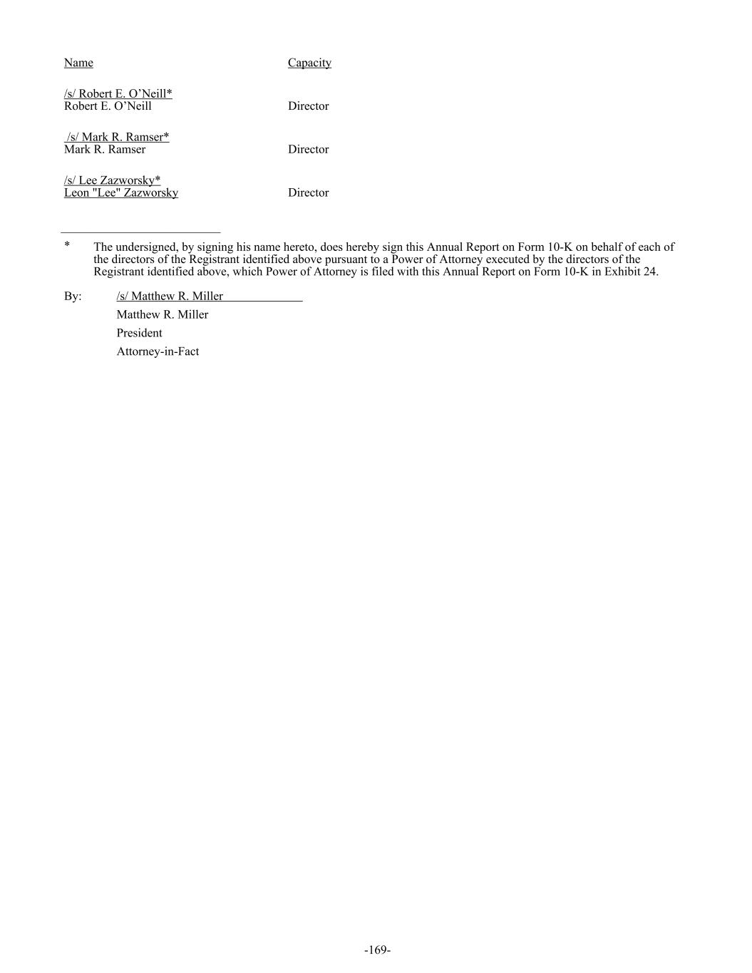 Name Capacity /s/ Robert E. O’Neill* Robert E. O’Neill Director /s/ Mark R. Ramser* Mark R. Ramser Director /s/ Lee Zazworsky* Leon "Lee" Zazworsky Director __________________________ * The undersigned, by signing his name hereto, does hereby sign this Annual Report on Form 10-K on behalf of each of the directors of the Registrant identified above pursuant to a Power of Attorney executed by the directors of the Registrant identified above, which Power of Attorney is filed with this Annual Report on Form 10-K in Exhibit 24. By: /s/ Matthew R. Miller Matthew R. Miller President Attorney-in-Fact -169-