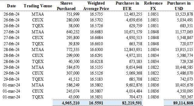 From February 26, 2024 to (and including) March 1, 2024, the Company has purchased a total of 4,965,210 ordinary shares for a total consideration of €82,219,591, equivalent to USD89,114,808.