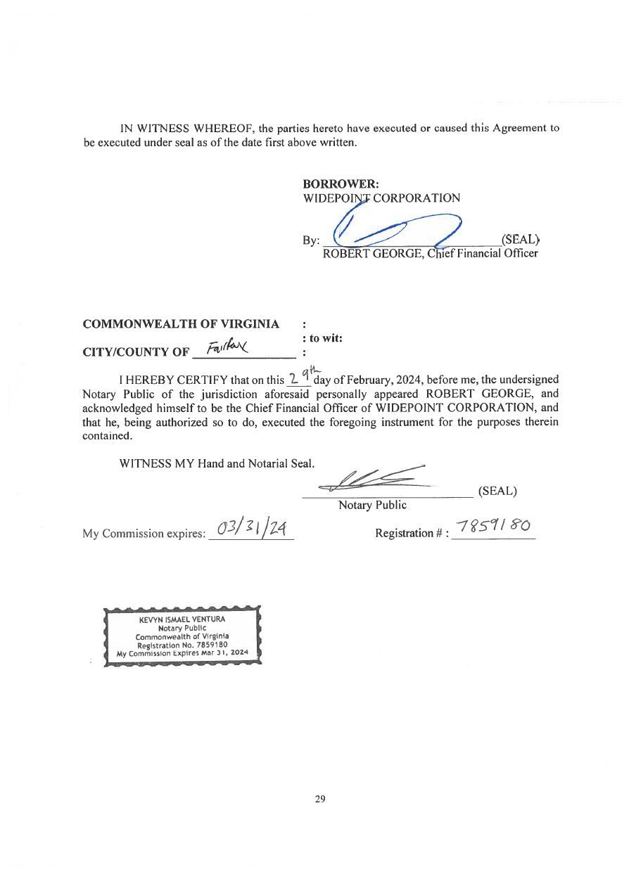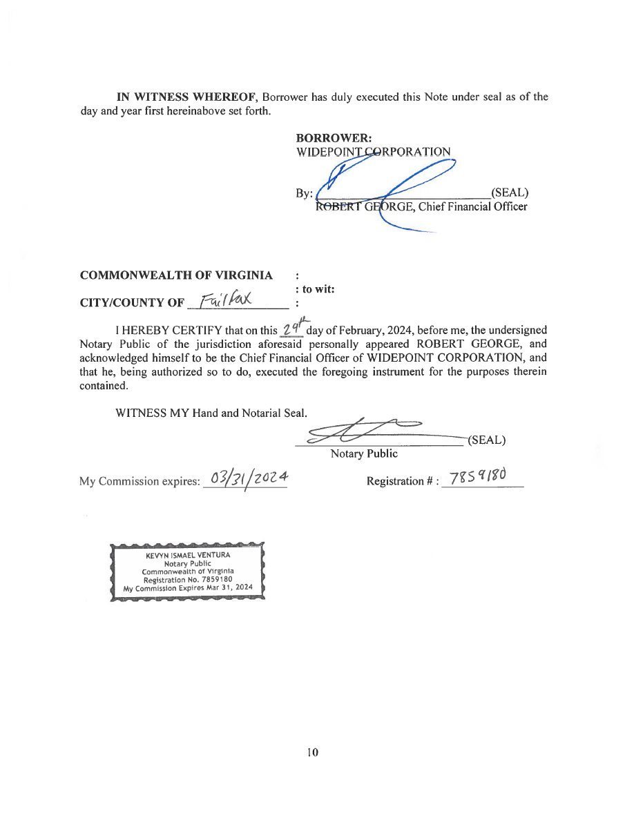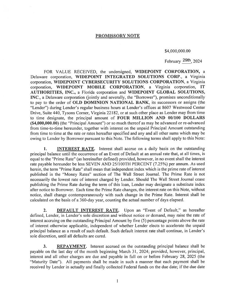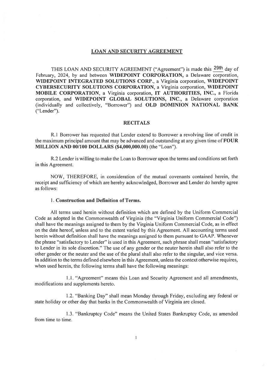On February 29, 2024, WidePoint Corporation and its subsidiaries (the “Company”), as borrower, entered into a Loan and Security Agreement (the “Loan”) and Promissory Note (the “Note,” and, together with the Loan, the “Agreements”) with Old Dominion National Bank. The Agreements provide for a new $4,000,000 revolving line of credit facility (the “Credit Facility”).