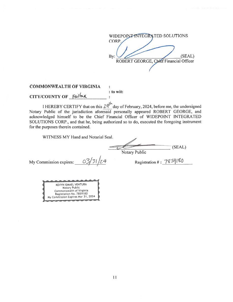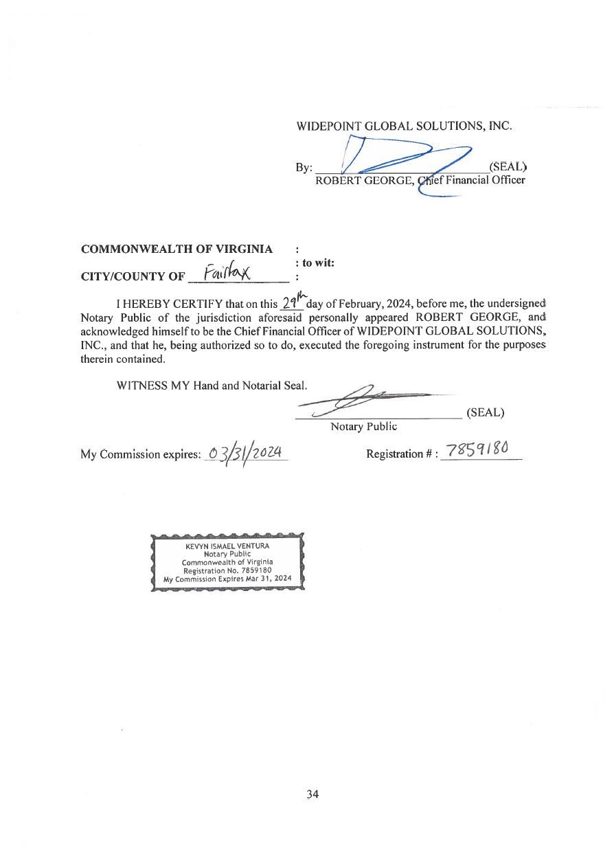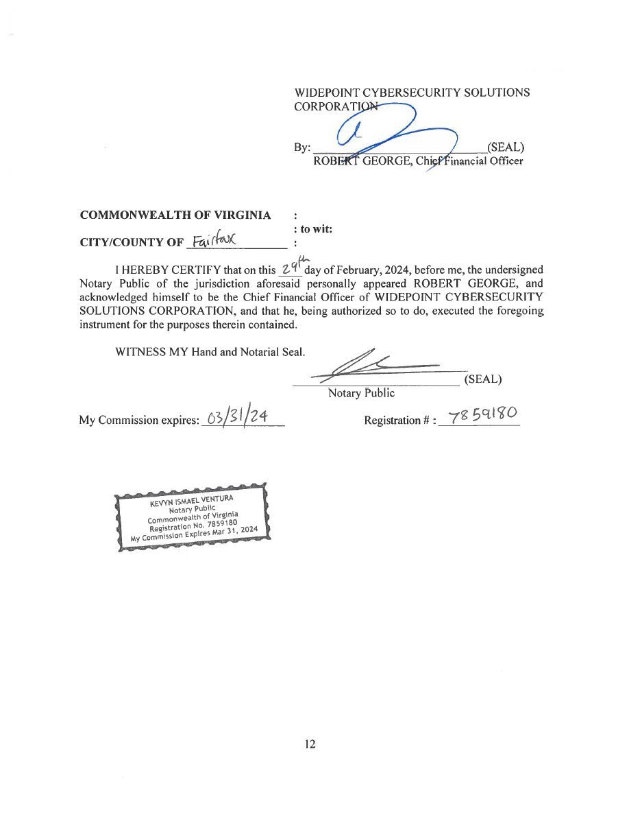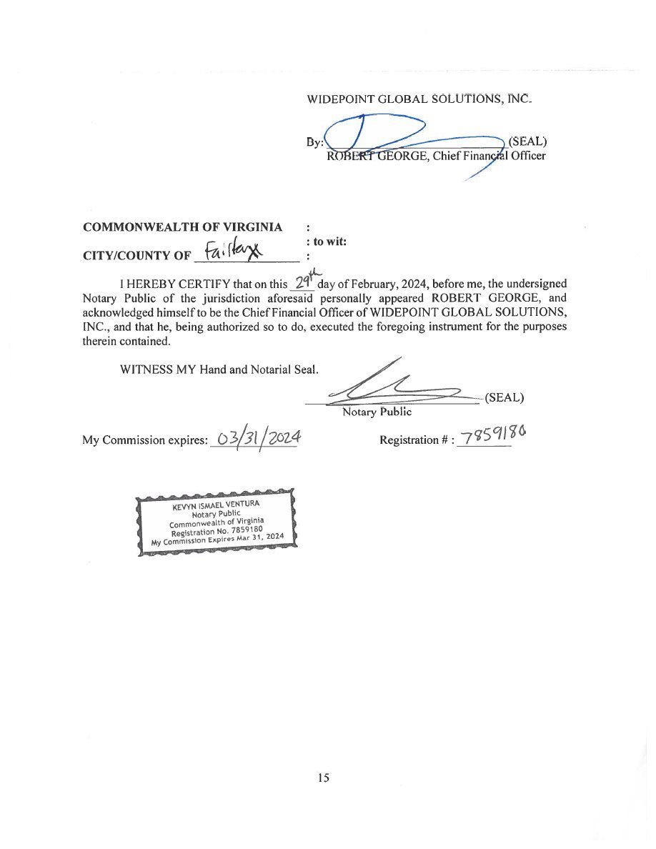 On February 29, 2024, WidePoint Corporation and its subsidiaries (the “Company”), as borrower, entered into a Loan and Security Agreement (the “Loan”) and Promissory Note (the “Note,” and, together with the Loan, the “Agreements”) with Old Dominion National Bank. The Agreements provide for a new $4,000,000 revolving line of credit facility (the “Credit Facility”).