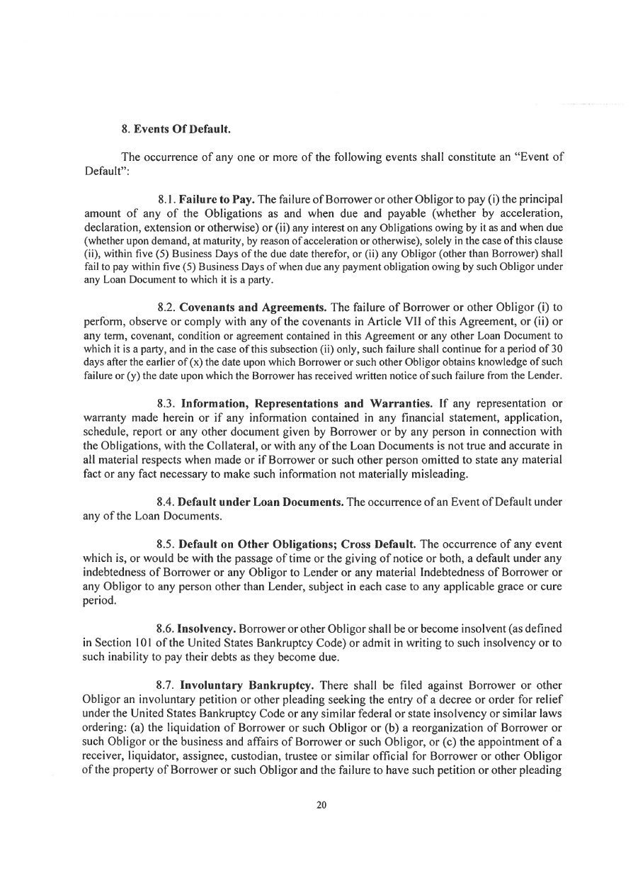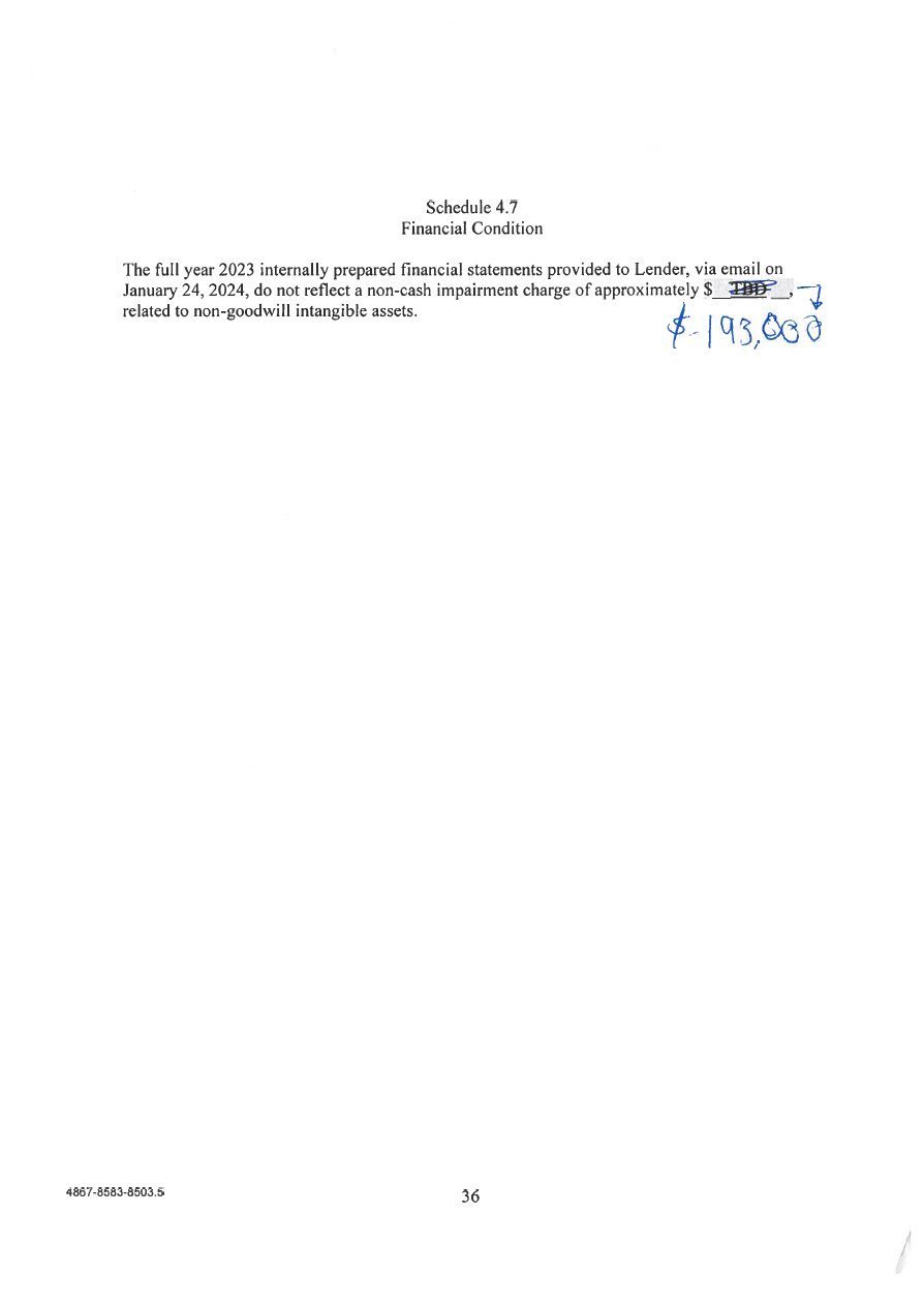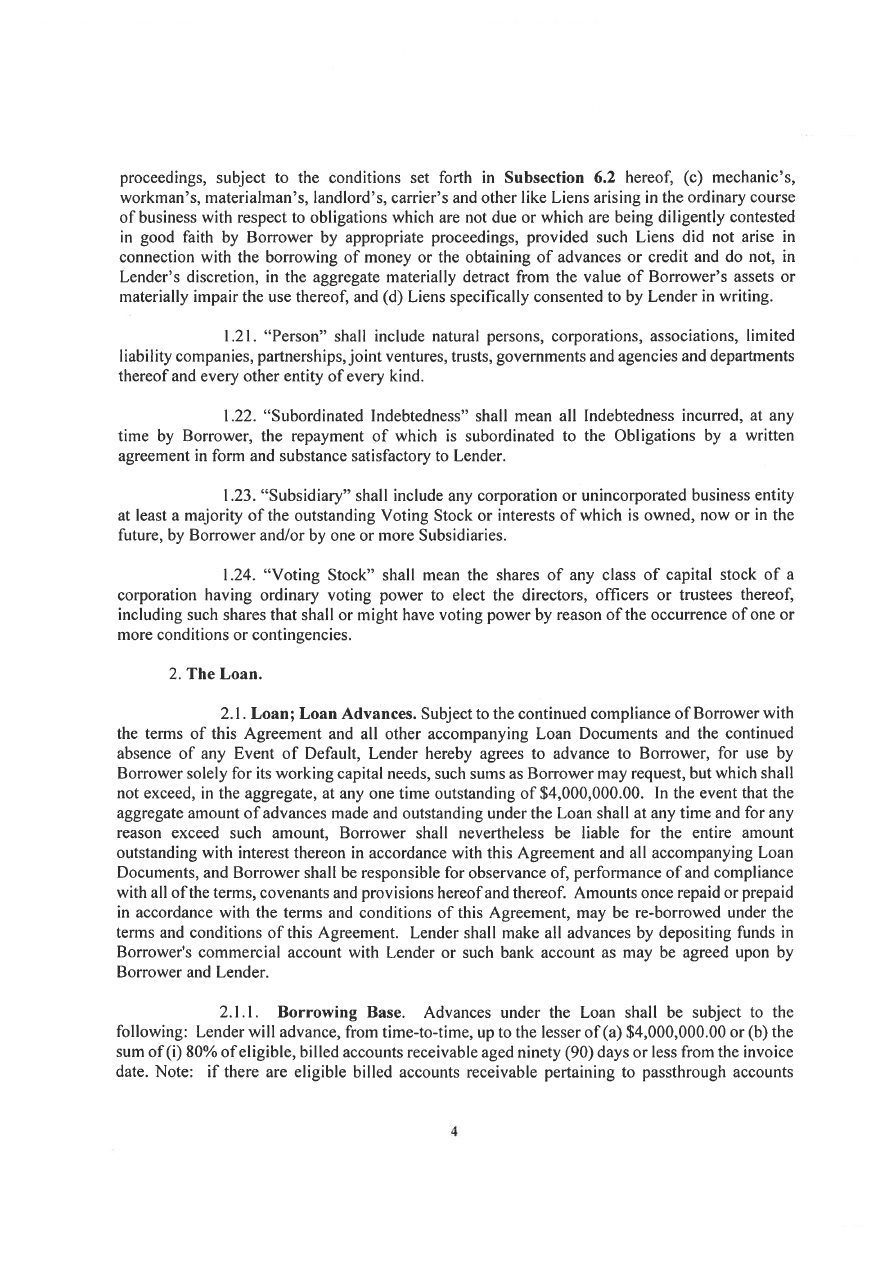 Advances under the Credit Facility are subject to a borrowing base equal to the lesser of (i) $4,000,000 or (ii) 80% of eligible accounts receivable. Interest accrues on the outstanding principal balance of the Credit Facility at an annual rate equal to the Prime Rate published in The Wall Street Journal, subject to a floor rate of 7.25%. Outstanding interest on the amount borrowed is payable monthly and all outstanding interest and principal is due on the maturity date of February 28, 2025. The Credit Facility includes customary covenants and events of default, including the following items that are measured annually commencing December 31, 2024: (i) a minimum tangible net worth of $2.0 million; (ii) a minimum annual EBITDA of $1.0 million and (iii) a ratio of current assets to current liabilities of not less than 1.0 to 1.0.