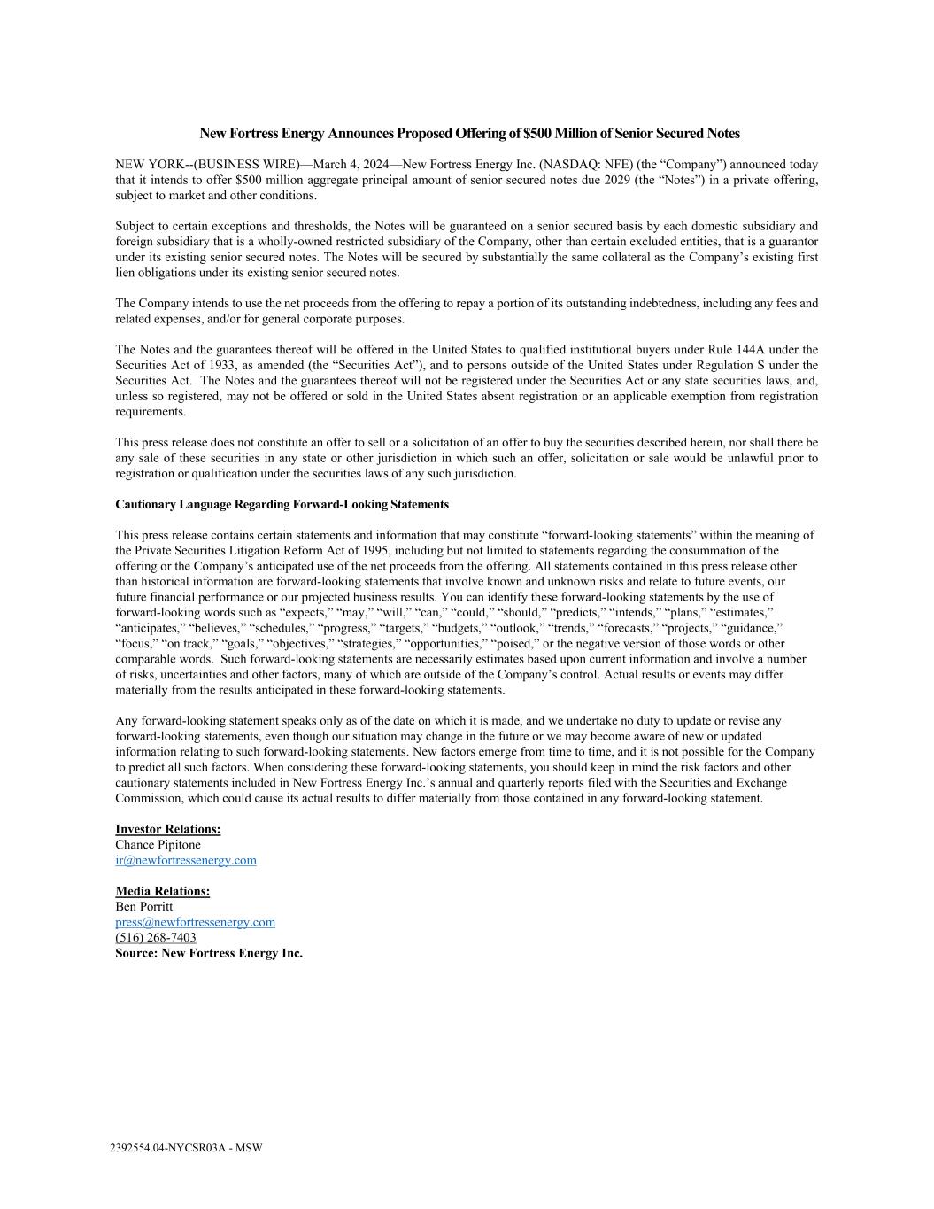 2392554.04-NYCSR03A - MSW New Fortress Energy Announces Proposed Offering of $500 Million of Senior Secured Notes NEW YORK--(BUSINESS WIRE)—March 4, 2024—New Fortress Energy Inc. (NASDAQ: NFE) (the “Company”) announced today that it intends to offer $500 million aggregate principal amount of senior secured notes due 2029 (the “Notes”) in a private offering, subject to market and other conditions. Subject to certain exceptions and thresholds, the Notes will be guaranteed on a senior secured basis by each domestic subsidiary and foreign subsidiary that is a wholly-owned restricted subsidiary of the Company, other than certain excluded entities, that is a guarantor under its existing senior secured notes. The Notes will be secured by substantially the same collateral as the Company’s existing first lien obligations under its existing senior secured notes. The Company intends to use the net proceeds from the offering to repay a portion of its outstanding indebtedness, including any fees and related expenses, and/or for general corporate purposes. The Notes and the guarantees thereof will be offered in the United States to qualified institutional buyers under Rule 144A under the Securities Act of 1933, as amended (the “Securities Act”), and to persons outside of the United States under Regulation S under the Securities Act. The Notes and the guarantees thereof will not be registered under the Securities Act or any state securities laws, and, unless so registered, may not be offered or sold in the United States absent registration or an applicable exemption from registration requirements. This press release does not constitute an offer to sell or a solicitation of an offer to buy the securities described herein, nor shall there be any sale of these securities in any state or other jurisdiction in which such an offer, solicitation or sale would be unlawful prior to registration or qualification under the securities laws of any such jurisdiction. Cautionary Language Regarding Forward-Looking Statements This press release contains certain statements and information that may constitute “forward-looking statements” within the meaning of the Private Securities Litigation Reform Act of 1995, including but not limited to statements regarding the consummation of the offering or the Company’s anticipated use of the net proceeds from the offering. All statements contained in this press release other than historical information are forward-looking statements that involve known and unknown risks and relate to future events, our future financial performance or our projected business results. You can identify these forward-looking statements by the use of forward-looking words such as “expects,” “may,” “will,” “can,” “could,” “should,” “predicts,” “intends,” “plans,” “estimates,” “anticipates,” “believes,” “schedules,” “progress,” “targets,” “budgets,” “outlook,” “trends,” “forecasts,” “projects,” “guidance,” “focus,” “on track,” “goals,” “objectives,” “strategies,” “opportunities,” “poised,” or the negative version of those words or other comparable words. Such forward-looking statements are necessarily estimates based upon current information and involve a number of risks, uncertainties and other factors, many of which are outside of the Company’s control. Actual results or events may differ materially from the results anticipated in these forward-looking statements. Any forward-looking statement speaks only as of the date on which it is made, and we undertake no duty to update or revise any forward-looking statements, even though our situation may change in the future or we may become aware of new or updated information relating to such forward-looking statements. New factors emerge from time to time, and it is not possible for the Company to predict all such factors. When considering these forward-looking statements, you should keep in mind the risk factors and other cautionary statements included in New Fortress Energy Inc.’s annual and quarterly reports filed with the Securities and Exchange Commission, which could cause its actual results to differ materially from those contained in any forward-looking statement. Investor Relations: Chance Pipitone ir@newfortressenergy.com Media Relations: Ben Porritt press@newfortressenergy.com (516) 268-7403 Source: New Fortress Energy Inc.