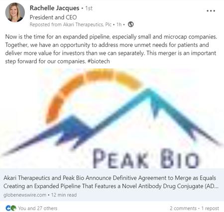 This communication relates to the proposed transaction pursuant to the terms of the Agreement and Plan of Merger (the “Merger Agreement”), by and among Akari Therapeutics, Plc, a public company limited by shares incorporated in England and Wales (“Akari”), Pegasus Merger Sub, Inc., a Delaware corporation and a wholly-owned subsidiary of Akari and Peak Bio, Inc. (“Peak Bio”) and includes express or implied forward-looking statements within the meaning of Section 27A of the Securities Act of 1933, as amended, and Section 21E of the Securities Exchange Act of 1934, as amended, about the proposed transaction between Peak Bio and Akari and the operations of the combined company that involve risks and uncertainties relating to future events and the future performance of Akari and Peak Bio. Actual events or results may differ materially from these forward-looking statements. Words such as “will,” “could,” “would,” “should,” “expect,” “plan,” “anticipate,” “intend,” “believe,” “estimate,” “predict,” “project,” “potential,” “continue,” “future,” “opportunity” “will likely result,” “target,” variations of such words, and similar expressions or negatives of these words are intended to identify such forward-looking statements, although not all forward-looking statements contain these identifying words. Examples of such forward-looking statements include, but are not limited to, express or implied statements regarding: the Merger (as defined in the Merger Agreement) and related matters, including, but not limited to, satisfaction of closing conditions to the proposed transaction, prospective performance and opportunities with respect to Akari or Peak Bio, post-closing operations and the outlook for the companies’ businesses; Akari’s, Peak Bio’s or the combined company’s targets, plans, objectives or goals for future operations, including those related to Akari’s and Peak Bio’s product candidates, research and development, product candidate introductions and product candidate approvals as well as cooperation in relation thereto; projections of or targets for revenues, costs, income (or loss), earnings per share, capital expenditures, dividends, capital structure, net financials and other financial measures; future economic performance, future actions and outcome of contingencies such as legal proceedings; and the assumptions underlying or relating to such statements.