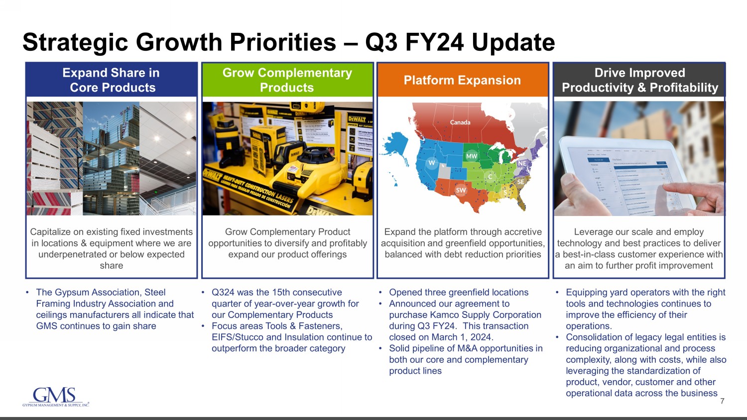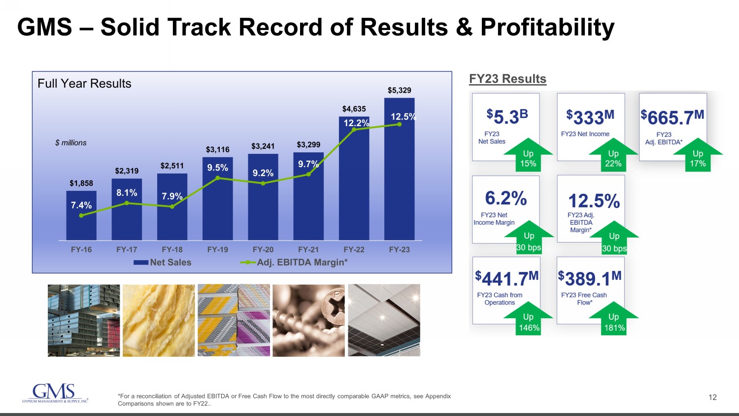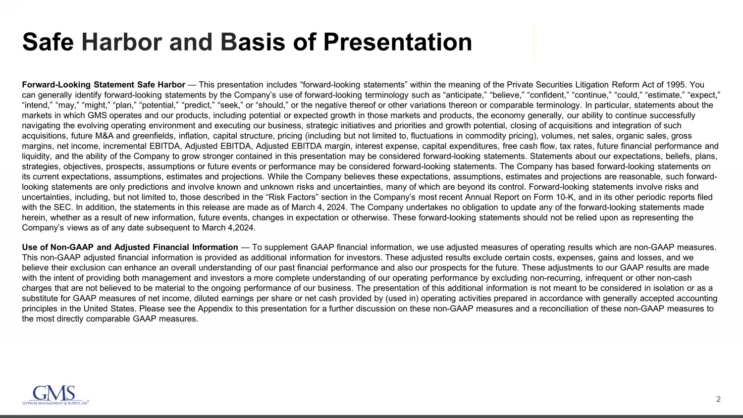2 Safe Harbor and B asis of Presentation Forward - Looking Statement Safe Harbor — This presentation includes “forward - looking statements” within the meaning of the Private Securities Litigation Reform Act of 1995. You can generally identify forward - looking statements by the Company’s use of forward - looking terminology such as “anticipate,” “bel ieve,” “confident,” “continue,” “could,” “estimate,” “expect,” “intend,” “may,” “might,” “plan,” “potential,” “predict,” “seek,” or “should,” or the negative thereof or other variations th ere on or comparable terminology. In particular, statements about the markets in which GMS operates and our products, including potential or expected growth in those markets and products, the eco nom y generally, our ability to continue successfully navigating the evolving operating environment and executing our business, strategic initiatives and priorities and growth pot ent ial, closing of acquisitions and integration of such acquisitions, future M&A and greenfields, inflation, capital structure, pricing (including but not limited to, fluctuations i n c ommodity pricing), volumes, net sales, organic sales, gross margins, net income, incremental EBITDA, Adjusted EBITDA, Adjusted EBITDA margin, interest expense, capital expenditures, fre e c ash flow, tax rates, future financial performance and liquidity, and the ability of the Company to grow stronger contained in this presentation may be considered forward - looking stat ements. Statements about our expectations, beliefs, plans, strategies, objectives, prospects, assumptions or future events or performance may be considered forward - looking statements. The Company has based forward - looking statements on its current expectations, assumptions, estimates and projections. While the Company believes these expectations, assumptions, es timates and projections are reasonable, such forward - looking statements are only predictions and involve known and unknown risks and uncertainties, many of which are beyond its c ont rol. Forward - looking statements involve risks and uncertainties, including, but not limited to, those described in the “Risk Factors” section in the Company’s most recent Annu al Report on Form 10 - K, and in its other periodic reports filed with the SEC. In addition, the statements in this release are made as of March 4, 2024. The Company undertakes no obligation to update any of the forward - looking statements made herein, whether as a result of new information, future events, changes in expectation or otherwise. These forward - looking statem ents should not be relied upon as representing the Company’s views as of any date subsequent to March 4,2024. Use of Non - GAAP and Adjusted Financial Information — To supplement GAAP financial information, we use adjusted measures of operating results which are non - GAAP measures. This non - GAAP adjusted financial information is provided as additional information for investors. These adjusted results exclude certain costs, expenses, gains and losses, and we believe their exclusion can enhance an overall understanding of our past financial performance and also our prospects for the fu ture. These adjustments to our GAAP results are made with the intent of providing both management and investors a more complete understanding of our operating performance by excl udi ng non - recurring, infrequent or other non - cash charges that are not believed to be material to the ongoing performance of our business. The presentation of this additional inf ormation is not meant to be considered in isolation or as a substitute for GAAP measures of net income, diluted earnings per share or net cash provided by (used in) operating activities pr epared in accordance with generally accepted accounting principles in the United States. Please see the Appendix to this presentation for a further discussion on these non - GAAP measure s and a reconciliation of these non - GAAP measures to the most directly comparable GAAP measures.