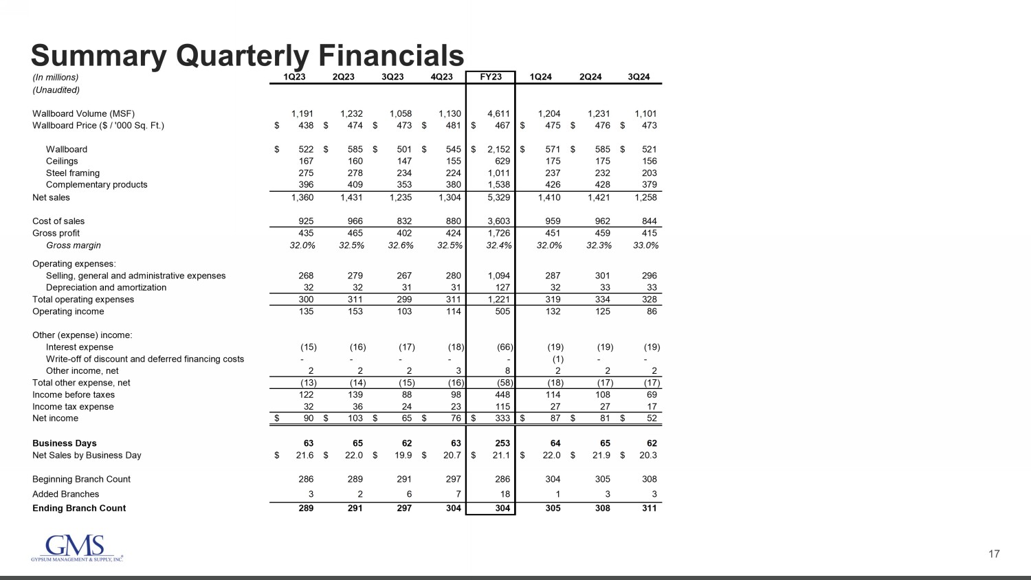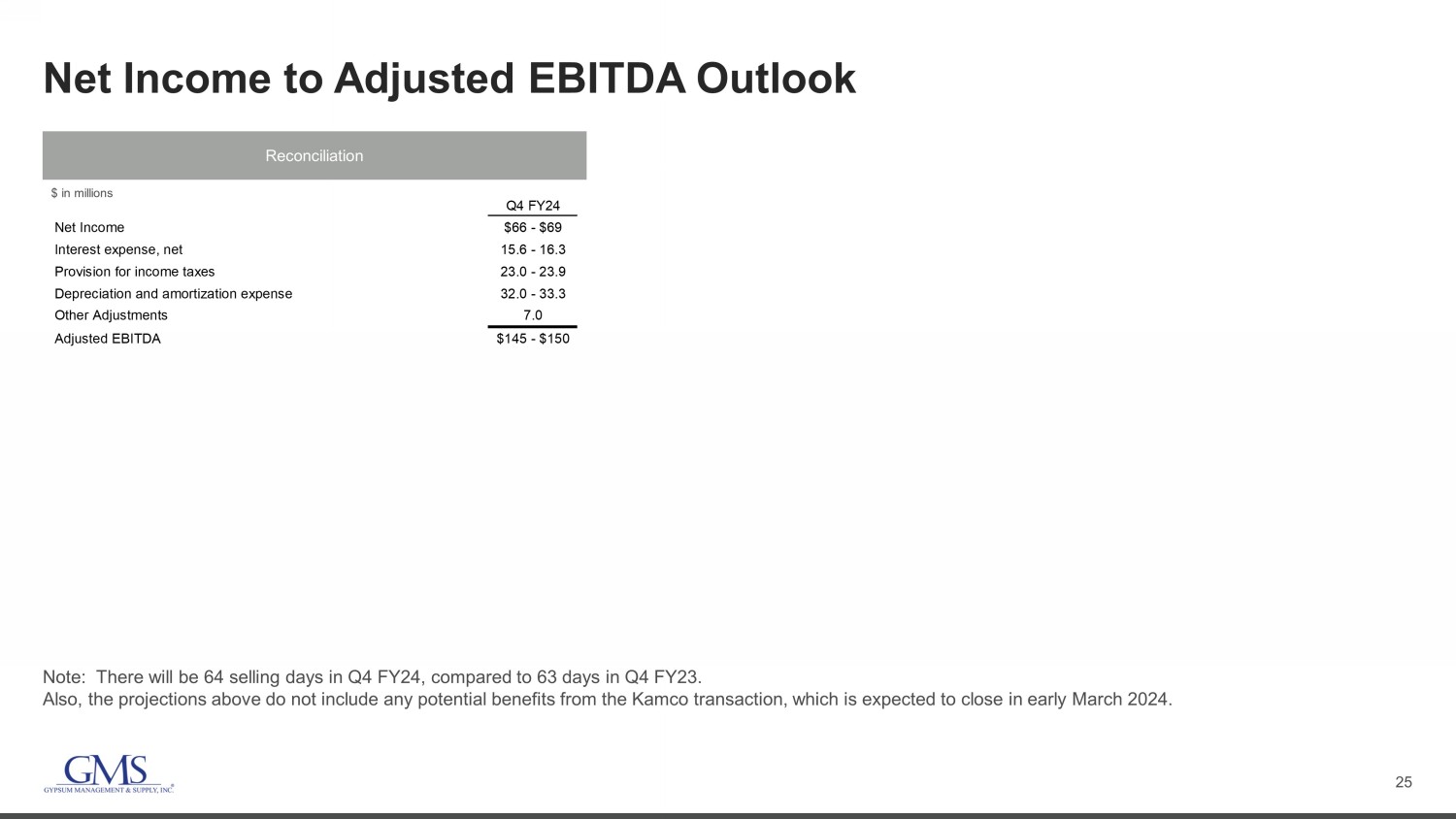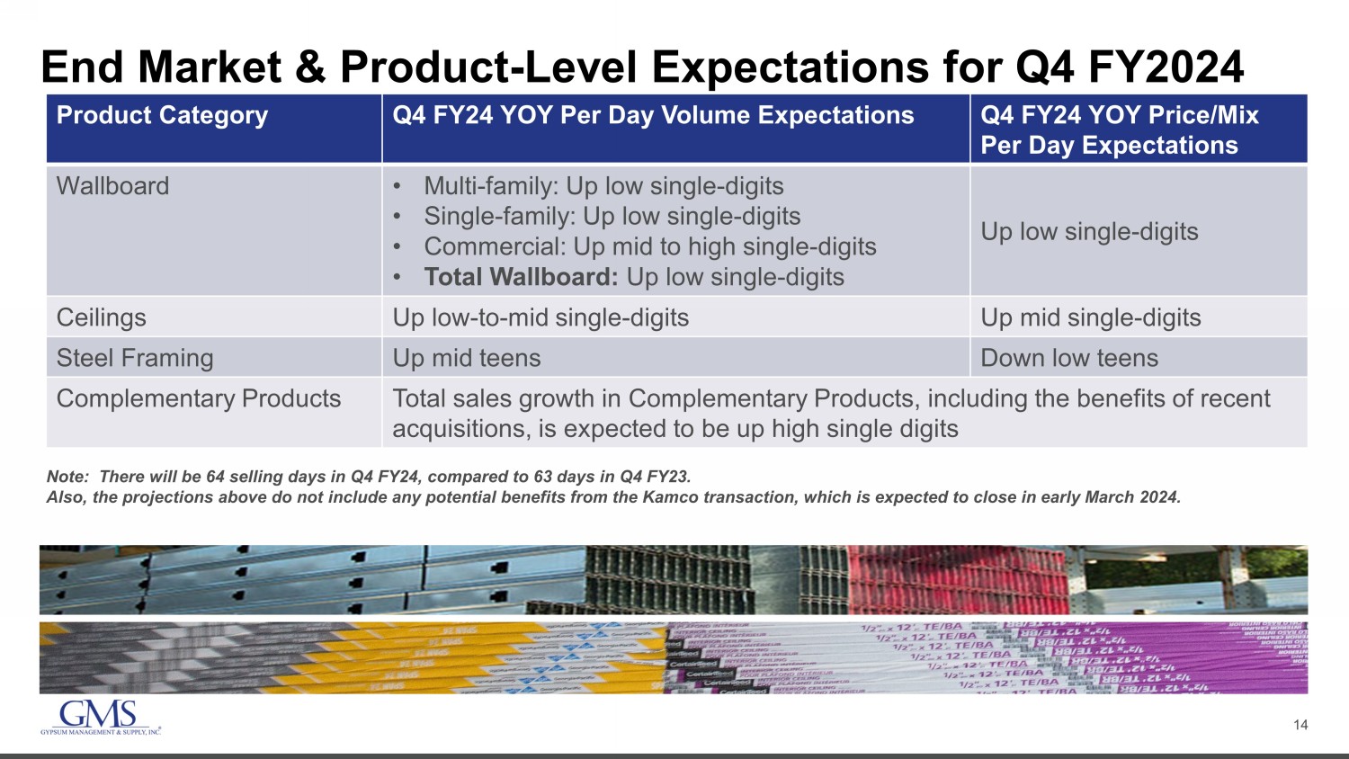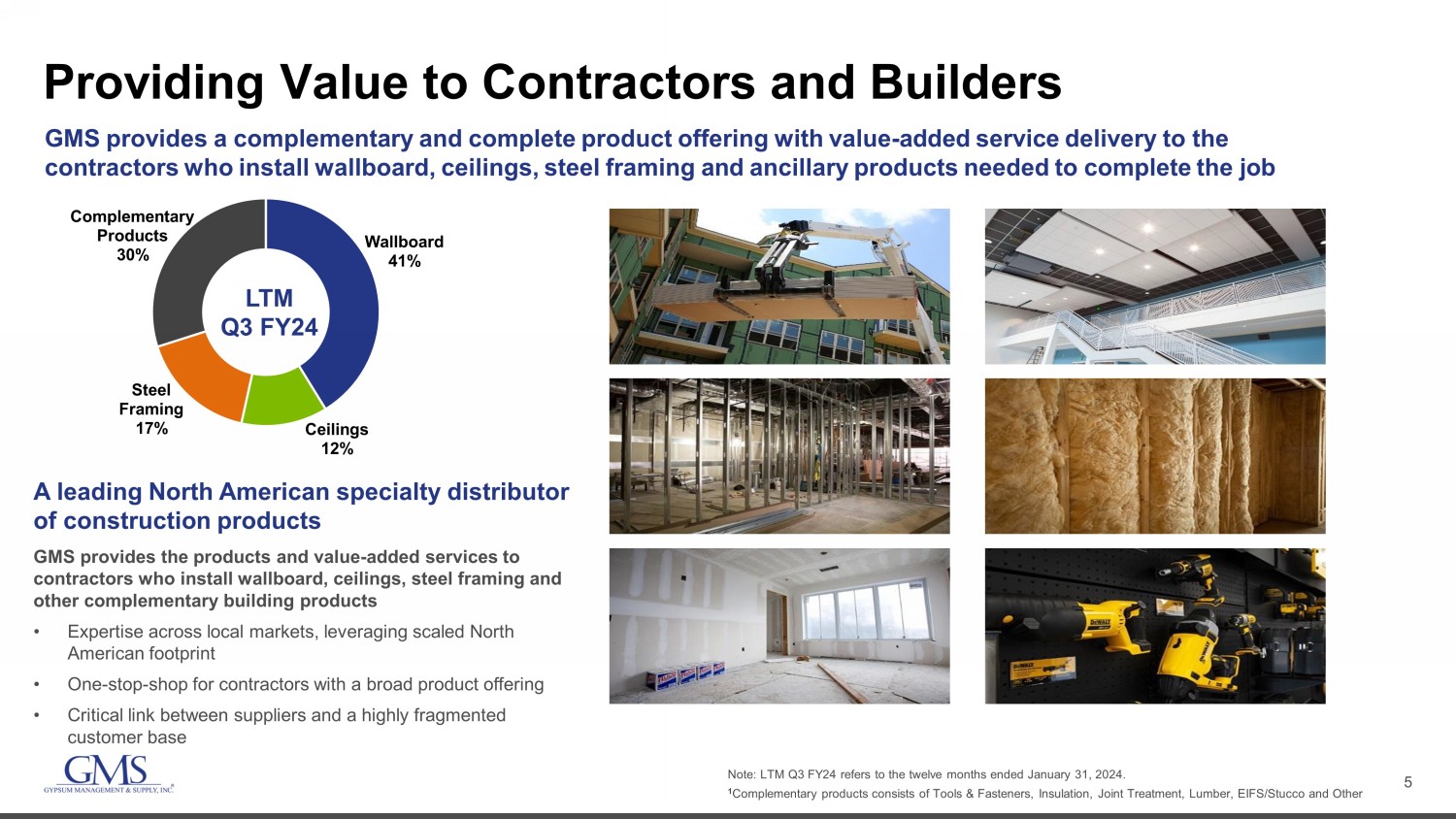 2 Safe Harbor and B asis of Presentation Forward - Looking Statement Safe Harbor — This presentation includes “forward - looking statements” within the meaning of the Private Securities Litigation Reform Act of 1995. You can generally identify forward - looking statements by the Company’s use of forward - looking terminology such as “anticipate,” “bel ieve,” “confident,” “continue,” “could,” “estimate,” “expect,” “intend,” “may,” “might,” “plan,” “potential,” “predict,” “seek,” or “should,” or the negative thereof or other variations th ere on or comparable terminology. In particular, statements about the markets in which GMS operates and our products, including potential or expected growth in those markets and products, the eco nom y generally, our ability to continue successfully navigating the evolving operating environment and executing our business, strategic initiatives and priorities and growth pot ent ial, closing of acquisitions and integration of such acquisitions, future M&A and greenfields, inflation, capital structure, pricing (including but not limited to, fluctuations i n c ommodity pricing), volumes, net sales, organic sales, gross margins, net income, incremental EBITDA, Adjusted EBITDA, Adjusted EBITDA margin, interest expense, capital expenditures, fre e c ash flow, tax rates, future financial performance and liquidity, and the ability of the Company to grow stronger contained in this presentation may be considered forward - looking stat ements. Statements about our expectations, beliefs, plans, strategies, objectives, prospects, assumptions or future events or performance may be considered forward - looking statements. The Company has based forward - looking statements on its current expectations, assumptions, estimates and projections. While the Company believes these expectations, assumptions, es timates and projections are reasonable, such forward - looking statements are only predictions and involve known and unknown risks and uncertainties, many of which are beyond its c ont rol. Forward - looking statements involve risks and uncertainties, including, but not limited to, those described in the “Risk Factors” section in the Company’s most recent Annu al Report on Form 10 - K, and in its other periodic reports filed with the SEC. In addition, the statements in this release are made as of March 4, 2024. The Company undertakes no obligation to update any of the forward - looking statements made herein, whether as a result of new information, future events, changes in expectation or otherwise. These forward - looking statem ents should not be relied upon as representing the Company’s views as of any date subsequent to March 4,2024. Use of Non - GAAP and Adjusted Financial Information — To supplement GAAP financial information, we use adjusted measures of operating results which are non - GAAP measures. This non - GAAP adjusted financial information is provided as additional information for investors. These adjusted results exclude certain costs, expenses, gains and losses, and we believe their exclusion can enhance an overall understanding of our past financial performance and also our prospects for the fu ture. These adjustments to our GAAP results are made with the intent of providing both management and investors a more complete understanding of our operating performance by excl udi ng non - recurring, infrequent or other non - cash charges that are not believed to be material to the ongoing performance of our business. The presentation of this additional inf ormation is not meant to be considered in isolation or as a substitute for GAAP measures of net income, diluted earnings per share or net cash provided by (used in) operating activities pr epared in accordance with generally accepted accounting principles in the United States. Please see the Appendix to this presentation for a further discussion on these non - GAAP measure s and a reconciliation of these non - GAAP measures to the most directly comparable GAAP measures.