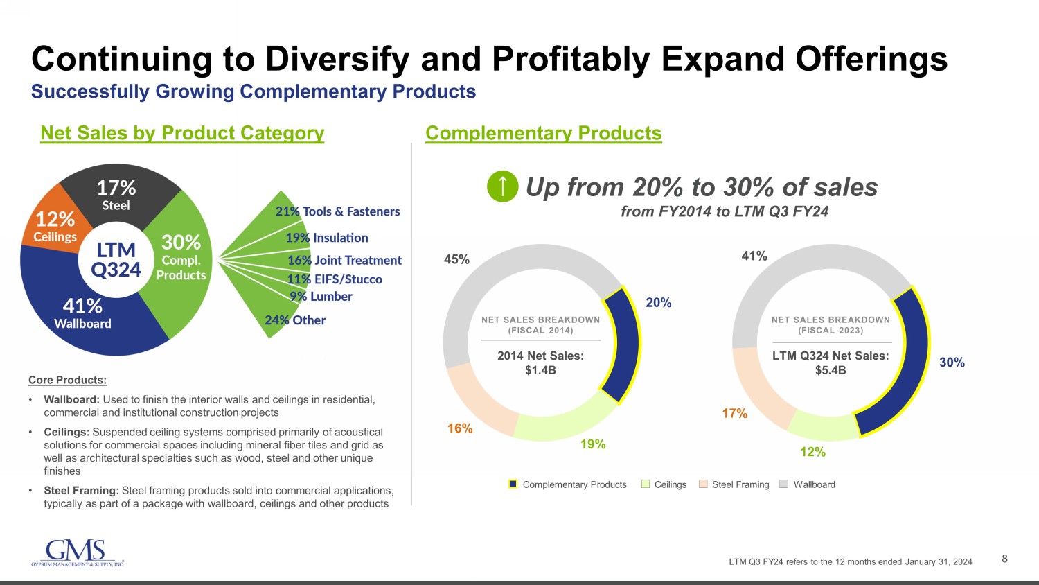 7 Drive Improved Productivity & Profitability Strategic Growth Priorities – Q3 FY24 Update Capitalize on existing fixed investments in locations & equipment where we are underpenetrated or below expected share Grow Complementary Product opportunities to diversify and profitably expand our product offerings Expand the platform through accretive acquisition and greenfield opportunities, balanced with debt reduction priorities Leverage our scale and employ technology and best practices to deliver a best - in - class customer experience with an aim to further profit improvement Expand Share in Core Products Grow Complementary Products Platform Expansion • The Gypsum Association, Steel Framing Industry Association and ceilings manufacturers all indicate that GMS continues to gain share • Q324 was the 15th consecutive quarter of year - over - year growth for our Complementary Products • Focus areas Tools & Fasteners, EIFS/Stucco and Insulation continue to outperform the broader category • Opened three greenfield locations • Announced our agreement to purchase Kamco Supply Corporation during Q3 FY24. This transaction closed on March 1, 2024. • Solid pipeline of M&A opportunities in both our core and complementary product lines • Equipping yard operators with the right tools and technologies continues to improve the efficiency of their operations. • Consolidation of legacy legal entities is reducing organizational and process complexity, along with costs, while also leveraging the standardization of product, vendor, customer and other operational data across the business