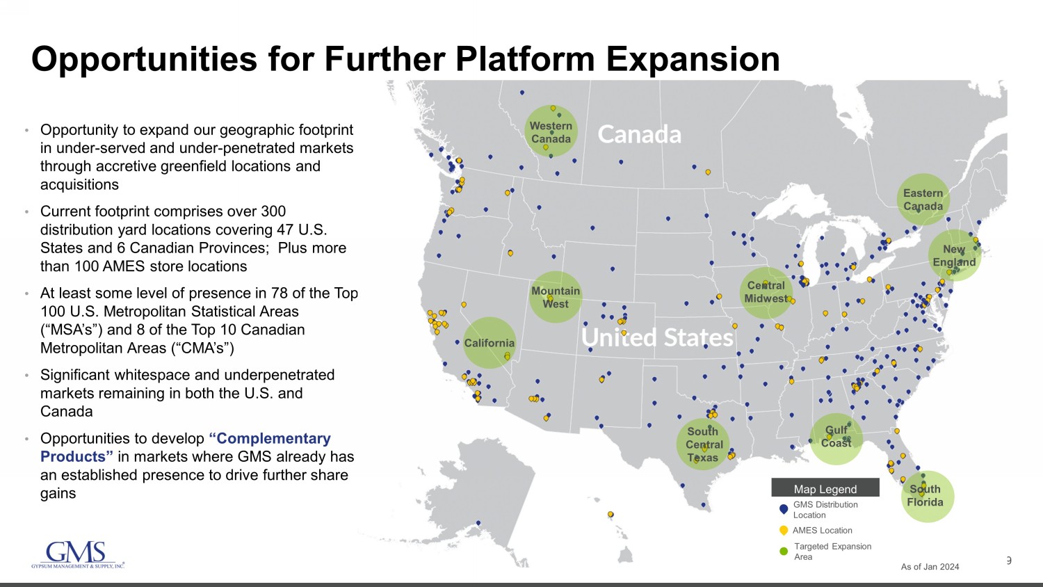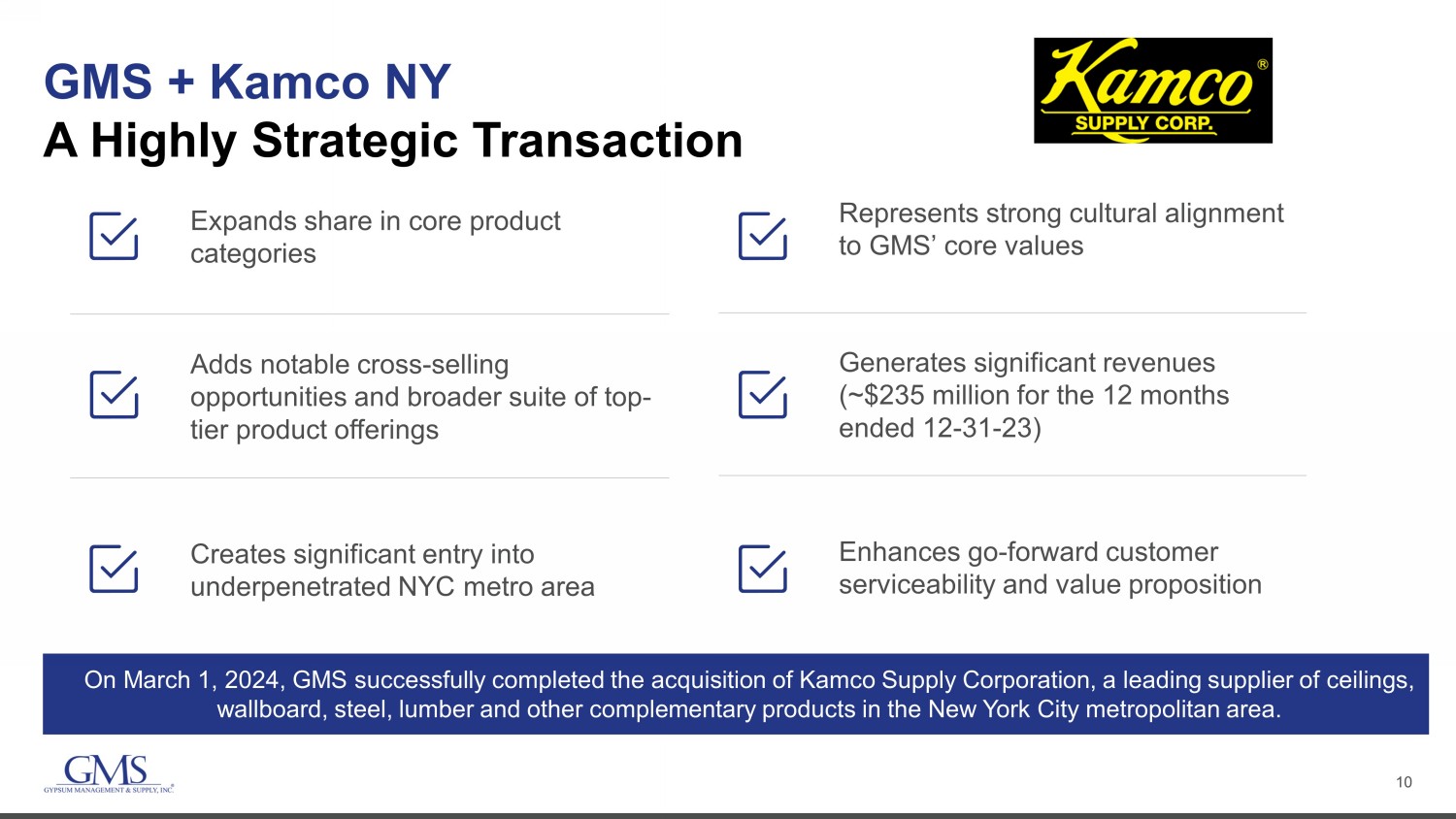 9 Opportunities for Further Platform Expansion • Opportunity to expand our geographic footprint in under - served and under - penetrated markets through accretive greenfield locations and acquisitions • Current footprint comprises over 300 distribution yard locations covering 47 U.S. States and 6 Canadian Provinces; Plus more than 100 AMES store locations • At least some level of presence in 78 of the Top 100 U.S. Metropolitan Statistical Areas (“MSA’s”) and 8 of the Top 10 Canadian Metropolitan Areas (“CMA’s”) • Significant whitespace and underpenetrated markets remaining in both the U.S. and Canada • Opportunities to develop “Complementary Products” in markets where GMS already has an established presence to drive further share gains GMS Distribution Location Map Legend Targeted Expansion Area California Mountain West Western Canada South Central Texas Central Midwest Gulf Coast New England Eastern Canada South Florida AMES Location As of Jan 2024