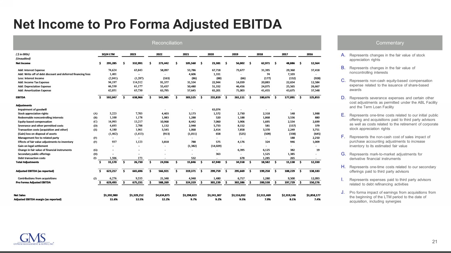 20 Quarterly Net Income to Adjusted EBITDA Reconciliation Commentary A. Represents changes in the fair value of stock appreciation rights B. Represents changes in the fair value of noncontrolling interests C. Represents non - cash equity - based compensation expense related to the issuance of share - based awards D. Represents severance expenses and certain other cost adjustments as permitted under the ABL Facility and the Term Loan Facility E. Represents one - time costs related to acquisitions paid to third parties F. Includes gains and losses from the sale and disposal of assets G. Represents the non - cash cost of sales impact of purchase accounting adjustments to increase inventory to its estimated fair value H. Represents expenses paid to third party advisors related to debt refinancing activities ( $ in 000s) 1Q23 2Q23 3Q23 4Q23 FY23 1Q24 2Q24 3Q24 (Unaudited) Net Income 89,470$ 103,153$ 64,775$ 75,593$ 332,991$ 86,830$ 80,957$ 51,905$ Add: Interest Expense 14,661 16,055 16,943 18,184 65,843 18,914 18,742 18,784 Add: Write off of debt discount and deferred financing fees - - - - - 1,401 - - Less: Interest Income (56) (154) (180) (897) (1,287) (474) (292) (378) Add: Income Tax Expense 32,030 35,995 23,697 22,790 114,512 26,734 27,205 17,468 Add: Depreciation Expense 14,993 15,058 15,162 15,964 61,177 16,327 16,963 17,276 Add: Amortization Expense 17,447 17,168 16,257 14,858 65,730 15,691 15,974 15,528 EBITDA 168,545$ 187,275$ 136,654$ 146,492$ 638,966$ 165,423$ 159,549$ 120,583$ Adjustments Stock appreciation rights (A) 2,344 3,230 314 1,815 7,703 1,218 401 1,789 Redeemable noncontrolling interests (B) 495 340 368 (25) 1,178 480 184 461 Equity-based compensation (C) 3,132 3,781 3,285 3,019 13,217 3,304 5,111 3,559 Severance and other permitted costs (D) 352 379 (315) 2,372 2,788 406 882 1,033 Transaction costs (acquisition and other) (E) 386 292 476 807 1,961 1,385 1,223 765 (Gain) loss on disposal of assets (F) (284) 81 (411) (799) (1,413) (131) (310) (222) Effects of fair value adjustments to inventory (G) 44 135 457 487 1,123 302 140 8 Debt transaction costs (H) - - - 173 173 911 378 44 Total Adjustments 6,469$ 8,238$ 4,174$ 7,849$ 26,730$ 7,875$ 8,009$ 7,437$ Adjusted EBITDA (as reported) 175,014$ 195,513$ 140,828$ 154,341$ 665,696$ 173,298$ 167,558$ 128,020$ Net Sales $1,359,553 $1,430,979 $1,234,618 $1,304,102 $5,329,252 $1,409,600 $1,420,930 $1,258,348 Adjusted EBITDA Margin 12.9% 13.7% 11.4% 11.8% 12.5% 12.3% 11.8% 10.2%