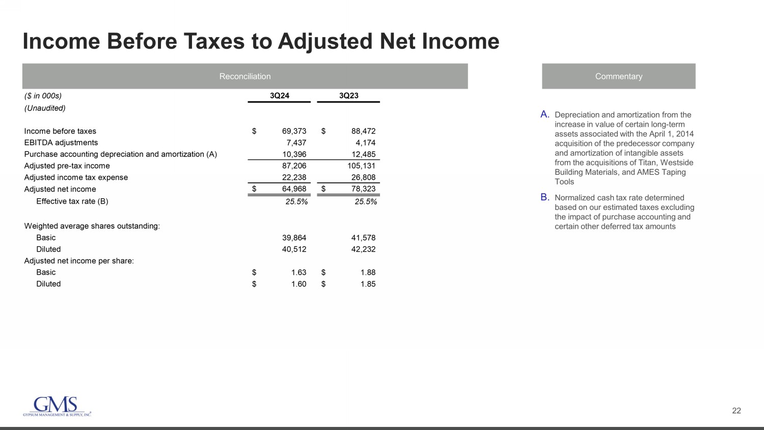 22 Income Before Taxes to Adjusted Net Income Reconciliation Commentary A. Depreciation and amortization from the increase in value of certain long - term assets associated with the April 1, 2014 acquisition of the predecessor company and amortization of intangible assets from the acquisitions of Titan, Westside Building Materials, and AMES Taping Tools B. Normalized cash tax rate determined based on our estimated taxes excluding the impact of purchase accounting and certain other deferred tax amounts ($ in 000s) 3Q24 3Q23 (Unaudited) Income before taxes 69,373$ 88,472$ EBITDA adjustments 7,437 4,174 Purchase accounting depreciation and amortization (A) 10,396 12,485 Adjusted pre-tax income 87,206 105,131 Adjusted income tax expense 22,238 26,808 Adjusted net income 64,968$ 78,323$ Effective tax rate (B) 25.5% 25.5% Weighted average shares outstanding: Basic 39,864 41,578 Diluted 40,512 42,232 Adjusted net income per share: Basic 1.63$ 1.88$ Diluted 1.60$ 1.85$