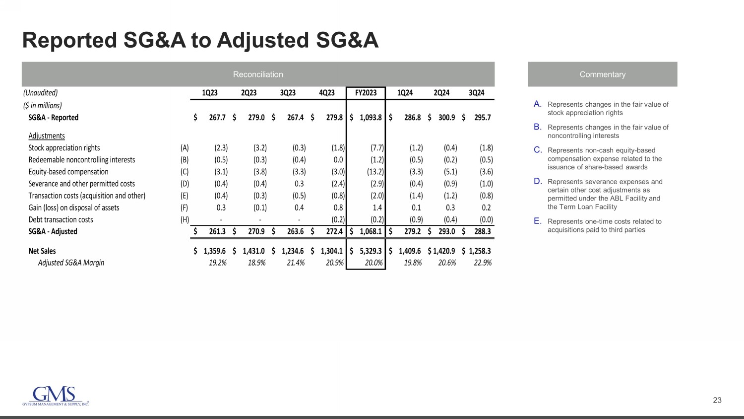 23 Reported SG&A to Adjusted SG&A Reconciliation Commentary A. Represents changes in the fair value of stock appreciation rights B. Represents changes in the fair value of noncontrolling interests C. Represents non - cash equity - based compensation expense related to the issuance of share - based awards D. Represents severance expenses and certain other cost adjustments as permitted under the ABL Facility and the Term Loan Facility E. Represents one - time costs related to acquisitions paid to third parties (Unaudited) 1Q23 2Q23 3Q23 4Q23 FY2023 1Q24 2Q24 3Q24 ($ in millions) SG&A - Reported 267.7$ 279.0$ 267.4$ 279.8$ 1,093.8$ 286.8$ 300.9$ 295.7$ Adjustments Stock appreciation rights (A) (2.3) (3.2) (0.3) (1.8) (7.7) (1.2) (0.4) (1.8) Redeemable noncontrolling interests (B) (0.5) (0.3) (0.4) 0.0 (1.2) (0.5) (0.2) (0.5) Equity-based compensation (C) (3.1) (3.8) (3.3) (3.0) (13.2) (3.3) (5.1) (3.6) Severance and other permitted costs (D) (0.4) (0.4) 0.3 (2.4) (2.9) (0.4) (0.9) (1.0) Transaction costs (acquisition and other) (E) (0.4) (0.3) (0.5) (0.8) (2.0) (1.4) (1.2) (0.8) Gain (loss) on disposal of assets (F) 0.3 (0.1) 0.4 0.8 1.4 0.1 0.3 0.2 Debt transaction costs (H) - - - (0.2) (0.2) (0.9) (0.4) (0.0) SG&A - Adjusted 261.3$ 270.9$ 263.6$ 272.4$ 1,068.1$ 279.2$ 293.0$ 288.3$ Net Sales 1,359.6$ 1,431.0$ 1,234.6$ 1,304.1$ 5,329.3$ 1,409.6$ 1,420.9$ 1,258.3$ Adjusted SG&A Margin 19.2% 18.9% 21.4% 20.9% 20.0% 19.8% 20.6% 22.9%
