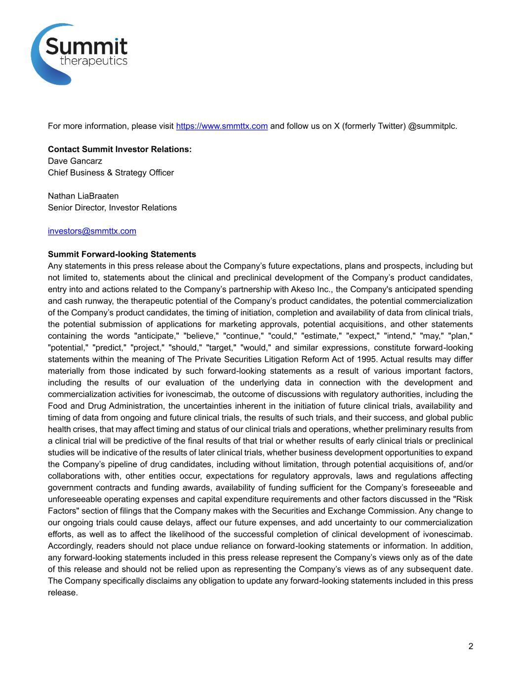2 For more information, please visit https://www.smmttx.com and follow us on X (formerly Twitter) @summitplc. Contact Summit Investor Relations: Dave Gancarz Chief Business & Strategy Officer Nathan LiaBraaten Senior Director, Investor Relations investors@smmttx.com Summit Forward-looking Statements Any statements in this press release about the Company’s future expectations, plans and prospects, including but not limited to, statements about the clinical and preclinical development of the Company’s product candidates, entry into and actions related to the Company’s partnership with Akeso Inc., the Company's anticipated spending and cash runway, the therapeutic potential of the Company’s product candidates, the potential commercialization of the Company’s product candidates, the timing of initiation, completion and availability of data from clinical trials, the potential submission of applications for marketing approvals, potential acquisitions, and other statements containing the words "anticipate," "believe," "continue," "could," "estimate," "expect," "intend," "may," "plan," "potential," "predict," "project," "should," "target," "would," and similar expressions, constitute forward-looking statements within the meaning of The Private Securities Litigation Reform Act of 1995. Actual results may differ materially from those indicated by such forward-looking statements as a result of various important factors, including the results of our evaluation of the underlying data in connection with the development and commercialization activities for ivonescimab, the outcome of discussions with regulatory authorities, including the Food and Drug Administration, the uncertainties inherent in the initiation of future clinical trials, availability and timing of data from ongoing and future clinical trials, the results of such trials, and their success, and global public health crises, that may affect timing and status of our clinical trials and operations, whether preliminary results from a clinical trial will be predictive of the final results of that trial or whether results of early clinical trials or preclinical studies will be indicative of the results of later clinical trials, whether business development opportunities to expand the Company’s pipeline of drug candidates, including without limitation, through potential acquisitions of, and/or collaborations with, other entities occur, expectations for regulatory approvals, laws and regulations affecting government contracts and funding awards, availability of funding sufficient for the Company’s foreseeable and unforeseeable operating expenses and capital expenditure requirements and other factors discussed in the "Risk Factors" section of filings that the Company makes with the Securities and Exchange Commission. Any change to our ongoing trials could cause delays, affect our future expenses, and add uncertainty to our commercialization efforts, as well as to affect the likelihood of the successful completion of clinical development of ivonescimab. Accordingly, readers should not place undue reliance on forward-looking statements or information. In addition, any forward-looking statements included in this press release represent the Company’s views only as of the date of this release and should not be relied upon as representing the Company’s views as of any subsequent date. The Company specifically disclaims any obligation to update any forward-looking statements included in this press release.