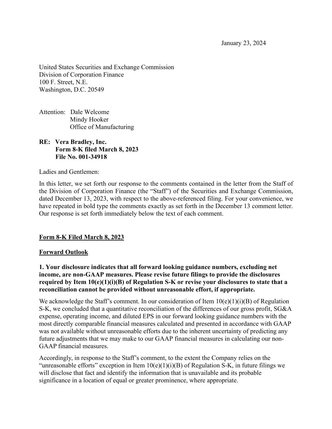 January 23, 2024 United States Securities and Exchange Commission Division of Corporation Finance 100 F. Street, N.E. Washington, D.C. 20549 Attention: Dale Welcome Mindy Hooker Office of Manufacturing RE: Vera Bradley, Inc. Form 8-K filed March 8, 2023 File No. 001-34918 Ladies and Gentlemen: In this letter, we set forth our response to the comments contained in the letter from the Staff of the Division of Corporation Finance (the “Staff”) of the Securities and Exchange Commission, dated December 13, 2023, with respect to the above-referenced filing. For your convenience, we have repeated in bold type the comments exactly as set forth in the December 13 comment letter. Our response is set forth immediately below the text of each comment. Form 8-K Filed March 8, 2023 Forward Outlook 1. Your disclosure indicates that all forward looking guidance numbers, excluding net income, are non-GAAP measures. Please revise future filings to provide the disclosures required by Item 10(e)(1)(i)(B) of Regulation S-K or revise your disclosures to state that a reconciliation cannot be provided without unreasonable effort, if appropriate. We acknowledge the Staff’s comment. In our consideration of Item 10(e)(1)(i)(B) of Regulation S-K, we concluded that a quantitative reconciliation of the differences of our gross profit, SG&A expense, operating income, and diluted EPS in our forward looking guidance numbers with the most directly comparable financial measures calculated and presented in accordance with GAAP was not available without unreasonable efforts due to the inherent uncertainty of predicting any future adjustments that we may make to our GAAP financial measures in calculating our non- GAAP financial measures. Accordingly, in response to the Staff’s comment, to the extent the Company relies on the “unreasonable efforts” exception in Item 10(e)(1)(i)(B) of Regulation S-K, in future filings we will disclose that fact and identify the information that is unavailable and its probable significance in a location of equal or greater prominence, where appropriate.
