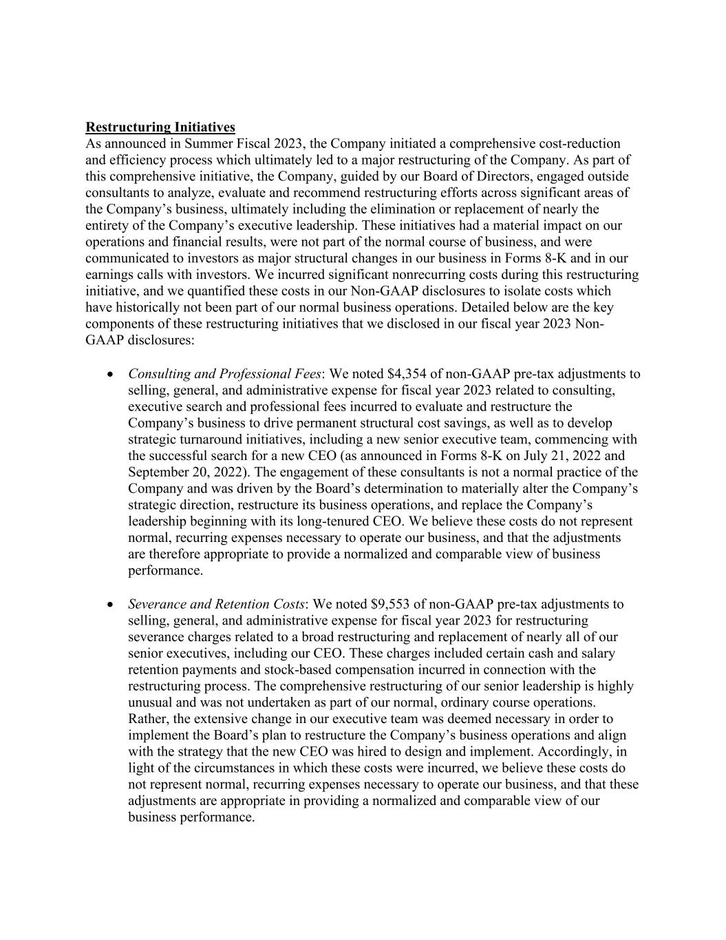 Restructuring Initiatives As announced in Summer Fiscal 2023, the Company initiated a comprehensive cost-reduction and efficiency process which ultimately led to a major restructuring of the Company. As part of this comprehensive initiative, the Company, guided by our Board of Directors, engaged outside consultants to analyze, evaluate and recommend restructuring efforts across significant areas of the Company’s business, ultimately including the elimination or replacement of nearly the entirety of the Company’s executive leadership. These initiatives had a material impact on our operations and financial results, were not part of the normal course of business, and were communicated to investors as major structural changes in our business in Forms 8-K and in our earnings calls with investors. We incurred significant nonrecurring costs during this restructuring initiative, and we quantified these costs in our Non-GAAP disclosures to isolate costs which have historically not been part of our normal business operations. Detailed below are the key components of these restructuring initiatives that we disclosed in our fiscal year 2023 Non- GAAP disclosures: • Consulting and Professional Fees: We noted $4,354 of non-GAAP pre-tax adjustments to selling, general, and administrative expense for fiscal year 2023 related to consulting, executive search and professional fees incurred to evaluate and restructure the Company’s business to drive permanent structural cost savings, as well as to develop strategic turnaround initiatives, including a new senior executive team, commencing with the successful search for a new CEO (as announced in Forms 8-K on July 21, 2022 and September 20, 2022). The engagement of these consultants is not a normal practice of the Company and was driven by the Board’s determination to materially alter the Company’s strategic direction, restructure its business operations, and replace the Company’s leadership beginning with its long-tenured CEO. We believe these costs do not represent normal, recurring expenses necessary to operate our business, and that the adjustments are therefore appropriate to provide a normalized and comparable view of business performance. • Severance and Retention Costs: We noted $9,553 of non-GAAP pre-tax adjustments to selling, general, and administrative expense for fiscal year 2023 for restructuring severance charges related to a broad restructuring and replacement of nearly all of our senior executives, including our CEO. These charges included certain cash and salary retention payments and stock-based compensation incurred in connection with the restructuring process. The comprehensive restructuring of our senior leadership is highly unusual and was not undertaken as part of our normal, ordinary course operations. Rather, the extensive change in our executive team was deemed necessary in order to implement the Board’s plan to restructure the Company’s business operations and align with the strategy that the new CEO was hired to design and implement. Accordingly, in light of the circumstances in which these costs were incurred, we believe these costs do not represent normal, recurring expenses necessary to operate our business, and that these adjustments are appropriate in providing a normalized and comparable view of our business performance.