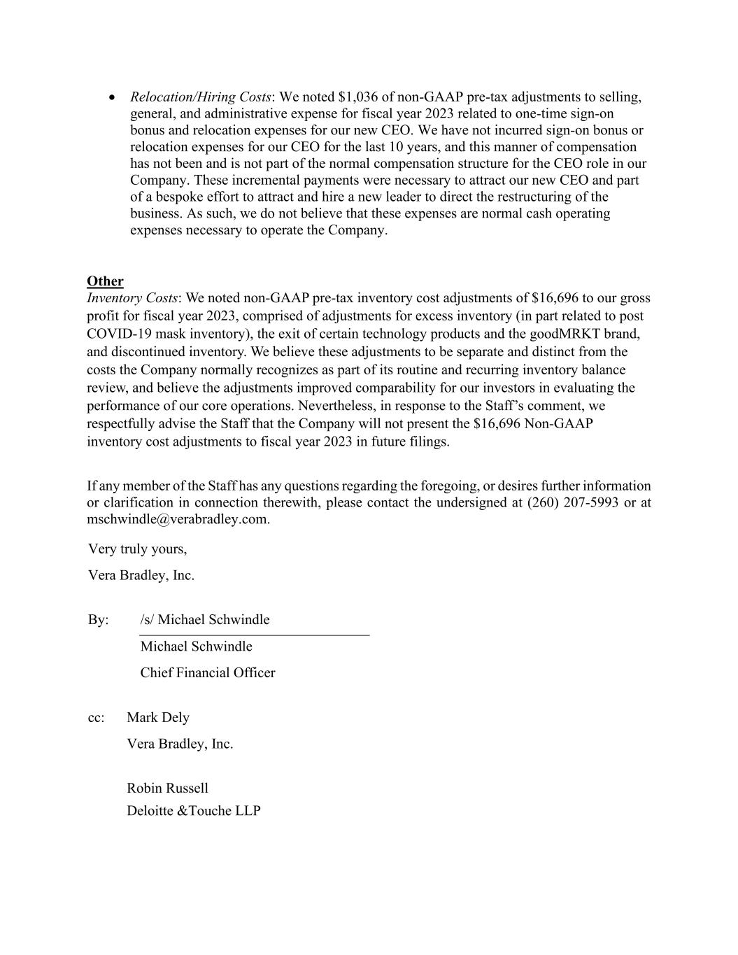 • Relocation/Hiring Costs: We noted $1,036 of non-GAAP pre-tax adjustments to selling, general, and administrative expense for fiscal year 2023 related to one-time sign-on bonus and relocation expenses for our new CEO. We have not incurred sign-on bonus or relocation expenses for our CEO for the last 10 years, and this manner of compensation has not been and is not part of the normal compensation structure for the CEO role in our Company. These incremental payments were necessary to attract our new CEO and part of a bespoke effort to attract and hire a new leader to direct the restructuring of the business. As such, we do not believe that these expenses are normal cash operating expenses necessary to operate the Company. Other Inventory Costs: We noted non-GAAP pre-tax inventory cost adjustments of $16,696 to our gross profit for fiscal year 2023, comprised of adjustments for excess inventory (in part related to post COVID-19 mask inventory), the exit of certain technology products and the goodMRKT brand, and discontinued inventory. We believe these adjustments to be separate and distinct from the costs the Company normally recognizes as part of its routine and recurring inventory balance review, and believe the adjustments improved comparability for our investors in evaluating the performance of our core operations. Nevertheless, in response to the Staff’s comment, we respectfully advise the Staff that the Company will not present the $16,696 Non-GAAP inventory cost adjustments to fiscal year 2023 in future filings. If any member of the Staff has any questions regarding the foregoing, or desires further information or clarification in connection therewith, please contact the undersigned at (260) 207-5993 or at mschwindle@verabradley.com. Very truly yours, Vera Bradley, Inc. By: /s/ Michael Schwindle Michael Schwindle Chief Financial Officer cc: Mark Dely Vera Bradley, Inc. Robin Russell Deloitte &Touche LLP