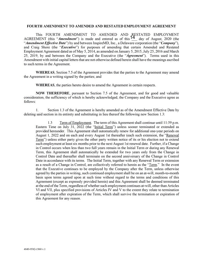 By signing below, the undersigned acknowledges and confirms that the undersigned has received and reviewed a copy of InspireMD, Inc. Executive Officer Clawback Policy (the “Policy”). Capitalized terms used but not otherwise defined in this Acknowledgement Form (this “Acknowledgement Form”) shall have the meanings ascribed to such terms in the Policy.
