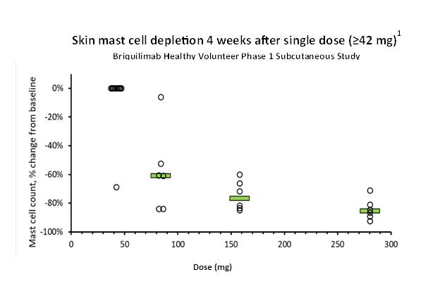 Figure 1 – Healthy volunteers administered single doses of briquilimab 42 mg to 280 mg subcutaneously received punch skin biopsies to evaluate the decreases in mast cells at 4 weeks after briquilimab was administered compared to the baseline.