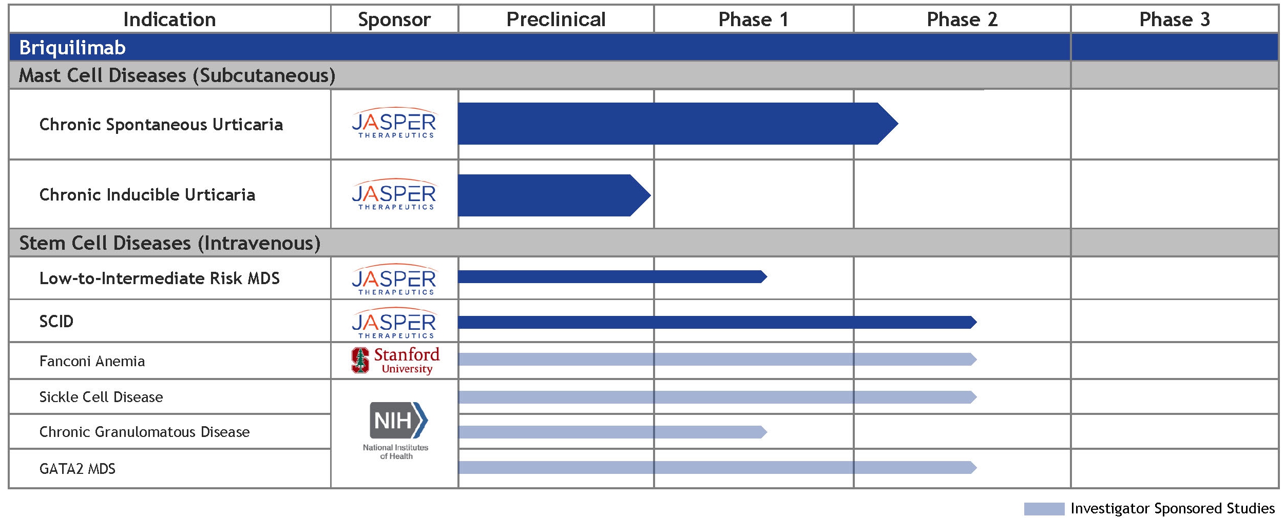 We are focused on advancing Briquilimab in development as a chronic therapy in mast cell driven diseases such as CSU, CIndU and other mast cell driven indications currently under evaluation. We also currently have an ongoing study in LR-MDS, as well as a study as a conditioning agent to clear HSCs from the bone marrow prior to re-transplant in patients with SCID. We partnered with the National Institutes of Health (the “NIH”) and Stanford University in several investigator sponsored trials for patients with a variety of diseases undergoing hematopoietic stem cell transplant.
