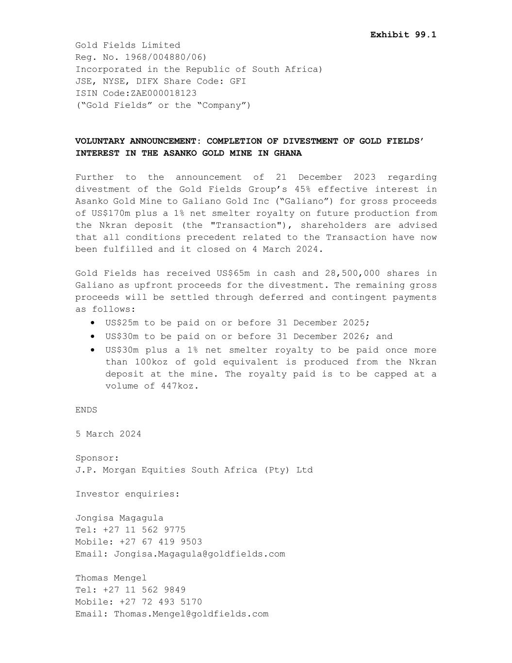 Exhibit 99.1 Gold Fields Limited Reg. No. 1968/004880/06) Incorporated in the Republic of South Africa) JSE, NYSE, DIFX Share Code: GFI ISIN Code:ZAE000018123 (“Gold Fields” or the “Company”) VOLUNTARY ANNOUNCEMENT: COMPLETION OF DIVESTMENT OF GOLD FIELDS’ INTEREST IN THE ASANKO GOLD MINE IN GHANA Further to the announcement of 21 December 2023 regarding divestment of the Gold Fields Group’s 45% effective interest in Asanko Gold Mine to Galiano Gold Inc (“Galiano”) for gross proceeds of US$170m plus a 1% net smelter royalty on future production from the Nkran deposit (the "Transaction"), shareholders are advised that all conditions precedent related to the Transaction have now been fulfilled and it closed on 4 March 2024. Gold Fields has received US$65m in cash and 28,500,000 shares in Galiano as upfront proceeds for the divestment. The remaining gross proceeds will be settled through deferred and contingent payments as follows: • US$25m to be paid on or before 31 December 2025; • US$30m to be paid on or before 31 December 2026; and • US$30m plus a 1% net smelter royalty to be paid once more than 100koz of gold equivalent is produced from the Nkran deposit at the mine. The royalty paid is to be capped at a volume of 447koz. ENDS 5 March 2024 Sponsor: J.P. Morgan Equities South Africa (Pty) Ltd Investor enquiries: Jongisa Magagula Tel: +27 11 562 9775 Mobile: +27 67 419 9503 Email: Jongisa.Magagula@goldfields.com Thomas Mengel Tel: +27 11 562 9849 Mobile: +27 72 493 5170 Email: Thomas.Mengel@goldfields.com