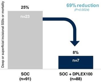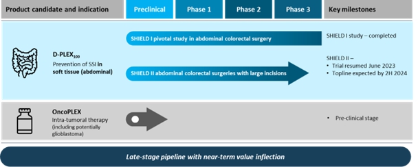 In September 2022, we announced top-line results from the SHIELD I Phase 3 study of D-PLEX100 for the prevention of SSIs in abdominal surgery. The SHIELD I study did not achieve its primary endpoint of reduction in SSIs, re-interventions due to SSIs and mortality: in the intent to treat, or ITT, population, the local administration of D-PLEX100 and SoC (n=485) resulted in a decrease in the primary endpoint of 23% compared to SoC alone (n=489) (p=0.1520). That said, in a pre-specified subgroup ITT analysis requested by the FDA of a total of 423 subjects with large incisions (>20 centimeters), the local administration of D-PLEX100 resulted in a significant reduction of 54% in the primary endpoint, compared to SoC alone (p=0.0032). Within the first 30 days post-surgery, SSIs decreased from 9.7% in the SoC treatment arm (n=211), as compared to 4.4% in the D-PLEX100 treatment arm (n=212). In addition, in exploratory post hoc analysis, the SHIELD I study also showed a 34% reduction in the primary endpoint in patients with one or more patient-specific risk factors (documented obesity- body mass index (BMI) >30 kg/m2, diabetes mellitus, hypertension, peripheral vascular disease, and chronic obstructive pulmonary disease/smoking) compared to SoC (post hoc analysis; p=0.047; n=680). Together, these results suggest potential prophylactic efficacy when D-PLEX is administered concomitantly with systemic antibacterial prophylaxis in patients with increased SSI risk factors, whether procedural or patient-specific comorbidities. Patients with either of these risk profiles are readily identifiable by the surgeon in the pre- and intra-operative periods, offering the option to apply D-PLEX after fascial closure but before skin closure. The SHIELD I study demonstrated a good safety profile of D-PLEX100: the overall incidence of treatment emergent adverse events, or TEAEs, was similar between study arms with numerically lower incidences of severe and serious TEAEs, and any TEAEs requiring surgical reinterventions in the D-PLEX arm compared to the SoC arm.