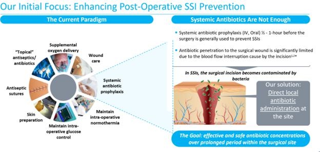 The World Health Organization, or WHO, estimates that SSIs result in up to $10 billion of additional hospital costs per year in the United States alone, and a further €11 billion per year in the European Union, or the EU. The Centers for Disease Control, or CDC, estimates that SSIs are the costliest hospital acquired infection, or HAI, type of event in the United States. SSIs occur in approximately 2% to 5% of all patients undergoing inpatient surgery worldwide and account for 20% of all HAIs in United States. In their last guidelines, the WHO and the CDC have labeled SSIs as a high priority unmet medical need due to the associated morbidity, mortality and economic cost burden.