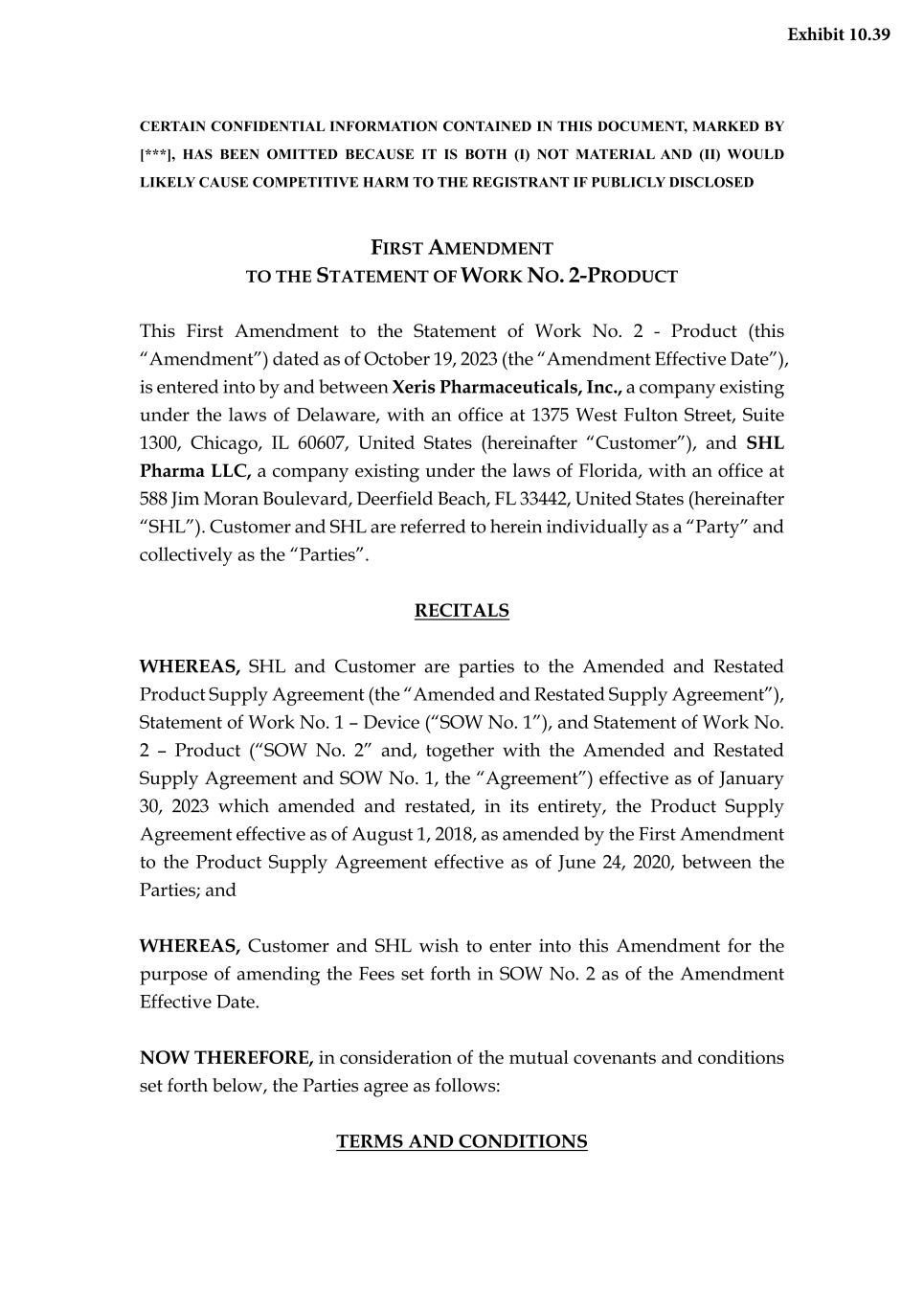 CERTAIN CONFIDENTIAL INFORMATION CONTAINED IN THIS DOCUMENT, MARKED BY [***], HAS BEEN OMITTED BECAUSE IT IS BOTH (I) NOT MATERIAL AND (II) WOULD LIKELY CAUSE COMPETITIVE HARM TO THE REGISTRANT IF PUBLICLY DISCLOSED FIRST AMENDMENT TO THE STATEMENT OF WORK NO. 2-PRODUCT This First Amendment to the Statement of Work No. 2 - Product (this “Amendment”) dated as of October 19, 2023 (the “Amendment Effective Date”), is entered into by and between Xeris Pharmaceuticals, Inc., a company existing under the laws of Delaware, with an office at 1375 West Fulton Street, Suite 1300, Chicago, IL 60607, United States (hereinafter “Customer”), and SHL Pharma LLC, a company existing under the laws of Florida, with an office at 588 Jim Moran Boulevard, Deerfield Beach, FL 33442, United States (hereinafter “SHL”). Customer and SHL are referred to herein individually as a “Party” and collectively as the “Parties”. RECITALS WHEREAS, SHL and Customer are parties to the Amended and Restated Product Supply Agreement (the “Amended and Restated Supply Agreement”), Statement of Work No. 1 – Device (“SOW No. 1”), and Statement of Work No. 2 – Product (“SOW No. 2” and, together with the Amended and Restated Supply Agreement and SOW No. 1, the “Agreement”) effective as of January 30, 2023 which amended and restated, in its entirety, the Product Supply Agreement effective as of August 1, 2018, as amended by the First Amendment to the Product Supply Agreement effective as of June 24, 2020, between the Parties; and WHEREAS, Customer and SHL wish to enter into this Amendment for the purpose of amending the Fees set forth in SOW No. 2 as of the Amendment Effective Date. NOW THEREFORE, in consideration of the mutual covenants and conditions set forth below, the Parties agree as follows: TERMS AND CONDITIONS Exhibit 10.39