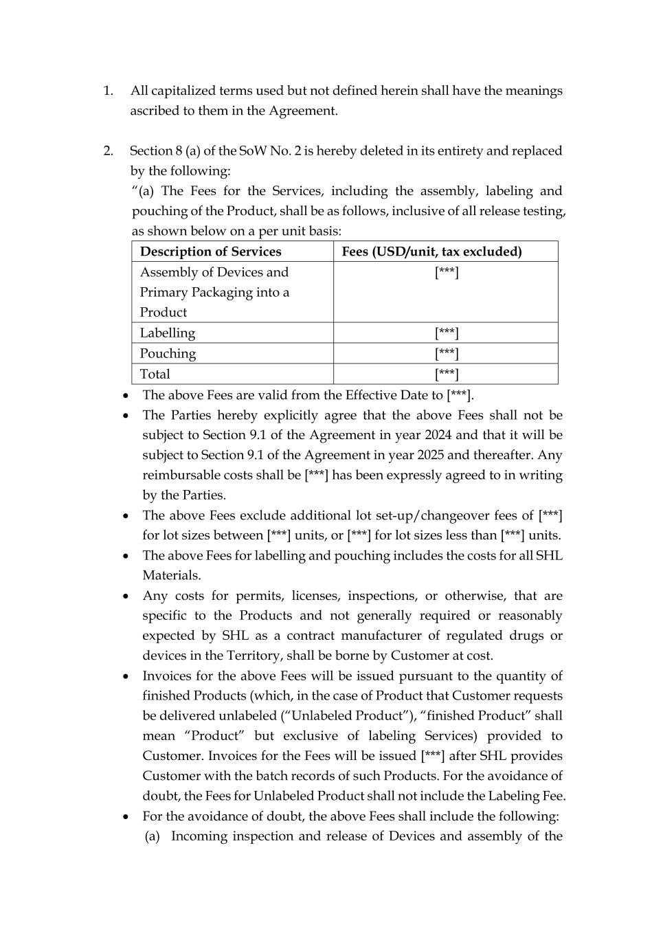 1. All capitalized terms used but not defined herein shall have the meanings ascribed to them in the Agreement. 2. Section 8 (a) of the SoW No. 2 is hereby deleted in its entirety and replaced by the following: “(a) The Fees for the Services, including the assembly, labeling and pouching of the Product, shall be as follows, inclusive of all release testing, as shown below on a per unit basis: Description of Services Fees (USD/unit, tax excluded) Assembly of Devices and Primary Packaging into a Product [***] Labelling [***] Pouching [***] Total [***] • The above Fees are valid from the Effective Date to [***]. • The Parties hereby explicitly agree that the above Fees shall not be subject to Section 9.1 of the Agreement in year 2024 and that it will be subject to Section 9.1 of the Agreement in year 2025 and thereafter. Any reimbursable costs shall be [***] has been expressly agreed to in writing by the Parties. • The above Fees exclude additional lot set-up/changeover fees of [***] for lot sizes between [***] units, or [***] for lot sizes less than [***] units. • The above Fees for labelling and pouching includes the costs for all SHL Materials. • Any costs for permits, licenses, inspections, or otherwise, that are specific to the Products and not generally required or reasonably expected by SHL as a contract manufacturer of regulated drugs or devices in the Territory, shall be borne by Customer at cost. • Invoices for the above Fees will be issued pursuant to the quantity of finished Products (which, in the case of Product that Customer requests be delivered unlabeled (“Unlabeled Product”), “finished Product” shall mean “Product” but exclusive of labeling Services) provided to Customer. Invoices for the Fees will be issued [***] after SHL provides Customer with the batch records of such Products. For the avoidance of doubt, the Fees for Unlabeled Product shall not include the Labeling Fee. • For the avoidance of doubt, the above Fees shall include the following: (a) Incoming inspection and release of Devices and assembly of the