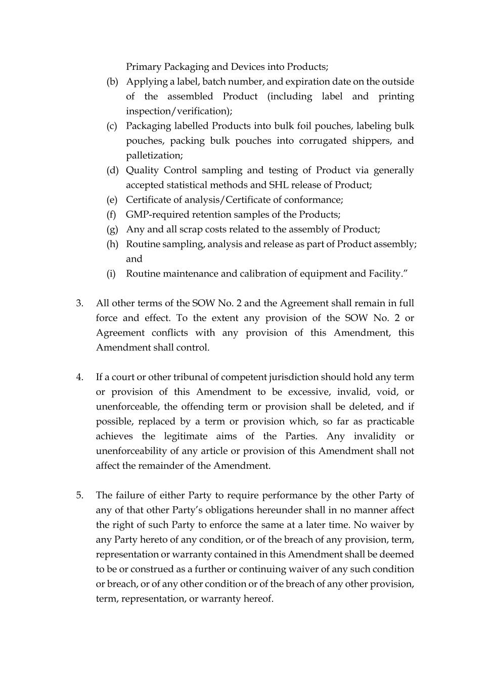 Primary Packaging and Devices into Products; (b) Applying a label, batch number, and expiration date on the outside of the assembled Product (including label and printing inspection/verification); (c) Packaging labelled Products into bulk foil pouches, labeling bulk pouches, packing bulk pouches into corrugated shippers, and palletization; (d) Quality Control sampling and testing of Product via generally accepted statistical methods and SHL release of Product; (e) Certificate of analysis/Certificate of conformance; (f) GMP-required retention samples of the Products; (g) Any and all scrap costs related to the assembly of Product; (h) Routine sampling, analysis and release as part of Product assembly; and (i) Routine maintenance and calibration of equipment and Facility.” 3. All other terms of the SOW No. 2 and the Agreement shall remain in full force and effect. To the extent any provision of the SOW No. 2 or Agreement conflicts with any provision of this Amendment, this Amendment shall control. 4. If a court or other tribunal of competent jurisdiction should hold any term or provision of this Amendment to be excessive, invalid, void, or unenforceable, the offending term or provision shall be deleted, and if possible, replaced by a term or provision which, so far as practicable achieves the legitimate aims of the Parties. Any invalidity or unenforceability of any article or provision of this Amendment shall not affect the remainder of the Amendment. 5. The failure of either Party to require performance by the other Party of any of that other Party’s obligations hereunder shall in no manner affect the right of such Party to enforce the same at a later time. No waiver by any Party hereto of any condition, or of the breach of any provision, term, representation or warranty contained in this Amendment shall be deemed to be or construed as a further or continuing waiver of any such condition or breach, or of any other condition or of the breach of any other provision, term, representation, or warranty hereof.