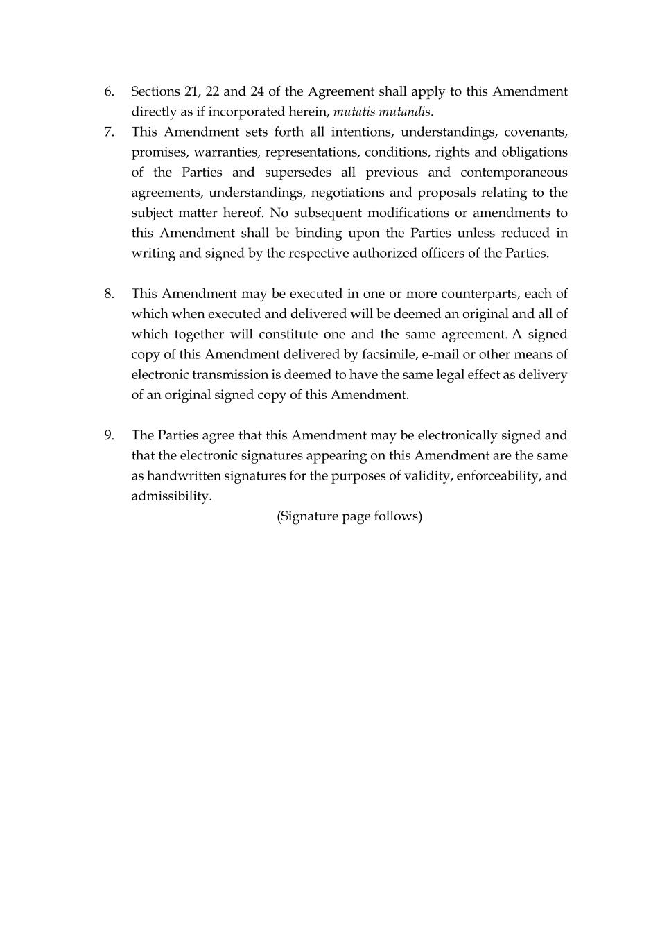 6. Sections 21, 22 and 24 of the Agreement shall apply to this Amendment directly as if incorporated herein, mutatis mutandis. 7. This Amendment sets forth all intentions, understandings, covenants, promises, warranties, representations, conditions, rights and obligations of the Parties and supersedes all previous and contemporaneous agreements, understandings, negotiations and proposals relating to the subject matter hereof. No subsequent modifications or amendments to this Amendment shall be binding upon the Parties unless reduced in writing and signed by the respective authorized officers of the Parties. 8. This Amendment may be executed in one or more counterparts, each of which when executed and delivered will be deemed an original and all of which together will constitute one and the same agreement. A signed copy of this Amendment delivered by facsimile, e-mail or other means of electronic transmission is deemed to have the same legal effect as delivery of an original signed copy of this Amendment. 9. The Parties agree that this Amendment may be electronically signed and that the electronic signatures appearing on this Amendment are the same as handwritten signatures for the purposes of validity, enforceability, and admissibility. (Signature page follows)