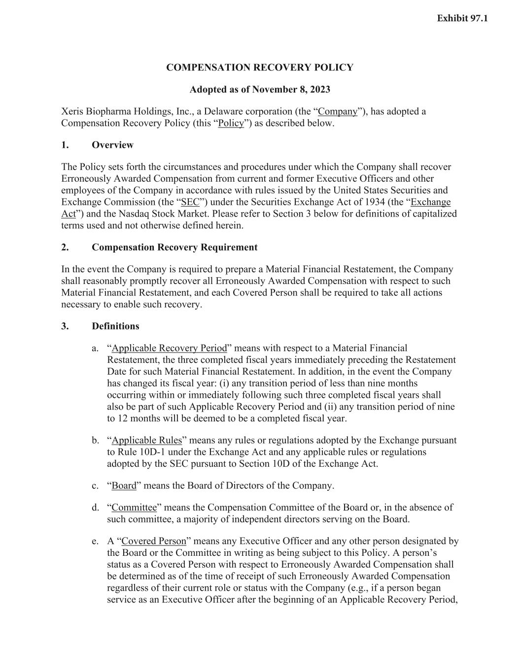 COMPENSATION RECOVERY POLICY Adopted as of November 8, 2023 Xeris Biopharma Holdings, Inc., a Delaware corporation (the “Company”), has adopted a Compensation Recovery Policy (this “Policy”) as described below. 1. Overview The Policy sets forth the circumstances and procedures under which the Company shall recover Erroneously Awarded Compensation from current and former Executive Officers and other employees of the Company in accordance with rules issued by the United States Securities and Exchange Commission (the “SEC”) under the Securities Exchange Act of 1934 (the “Exchange Act”) and the Nasdaq Stock Market. Please refer to Section 3 below for definitions of capitalized terms used and not otherwise defined herein. 2. Compensation Recovery Requirement In the event the Company is required to prepare a Material Financial Restatement, the Company shall reasonably promptly recover all Erroneously Awarded Compensation with respect to such Material Financial Restatement, and each Covered Person shall be required to take all actions necessary to enable such recovery. 3. Definitions a. “Applicable Recovery Period” means with respect to a Material Financial Restatement, the three completed fiscal years immediately preceding the Restatement Date for such Material Financial Restatement. In addition, in the event the Company has changed its fiscal year: (i) any transition period of less than nine months occurring within or immediately following such three completed fiscal years shall also be part of such Applicable Recovery Period and (ii) any transition period of nine to 12 months will be deemed to be a completed fiscal year. b. “Applicable Rules” means any rules or regulations adopted by the Exchange pursuant to Rule 10D-1 under the Exchange Act and any applicable rules or regulations adopted by the SEC pursuant to Section 10D of the Exchange Act. c. “Board” means the Board of Directors of the Company. d. “Committee” means the Compensation Committee of the Board or, in the absence of such committee, a majority of independent directors serving on the Board. e. A “Covered Person” means any Executive Officer and any other person designated by the Board or the Committee in writing as being subject to this Policy. A person’s status as a Covered Person with respect to Erroneously Awarded Compensation shall be determined as of the time of receipt of such Erroneously Awarded Compensation regardless of their current role or status with the Company (e.g., if a person began service as an Executive Officer after the beginning of an Applicable Recovery Period, Exhibit 97.1