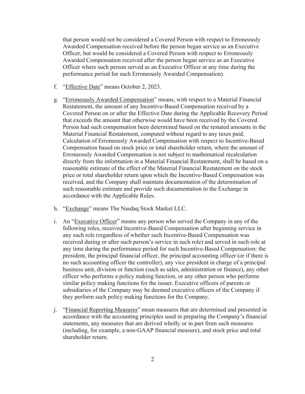 2 that person would not be considered a Covered Person with respect to Erroneously Awarded Compensation received before the person began service as an Executive Officer, but would be considered a Covered Person with respect to Erroneously Awarded Compensation received after the person began service as an Executive Officer where such person served as an Executive Officer at any time during the performance period for such Erroneously Awarded Compensation). f. “Effective Date” means October 2, 2023. g. “Erroneously Awarded Compensation” means, with respect to a Material Financial Restatement, the amount of any Incentive-Based Compensation received by a Covered Person on or after the Effective Date during the Applicable Recovery Period that exceeds the amount that otherwise would have been received by the Covered Person had such compensation been determined based on the restated amounts in the Material Financial Restatement, computed without regard to any taxes paid. Calculation of Erroneously Awarded Compensation with respect to Incentive-Based Compensation based on stock price or total shareholder return, where the amount of Erroneously Awarded Compensation is not subject to mathematical recalculation directly from the information in a Material Financial Restatement, shall be based on a reasonable estimate of the effect of the Material Financial Restatement on the stock price or total shareholder return upon which the Incentive-Based Compensation was received, and the Company shall maintain documentation of the determination of such reasonable estimate and provide such documentation to the Exchange in accordance with the Applicable Rules. h. “Exchange” means The Nasdaq Stock Market LLC. i. An “Executive Officer” means any person who served the Company in any of the following roles, received Incentive-Based Compensation after beginning service in any such role (regardless of whether such Incentive-Based Compensation was received during or after such person’s service in such role) and served in such role at any time during the performance period for such Incentive-Based Compensation: the president, the principal financial officer, the principal accounting officer (or if there is no such accounting officer the controller), any vice president in charge of a principal business unit, division or function (such as sales, administration or finance), any other officer who performs a policy making function, or any other person who performs similar policy making functions for the issuer. Executive officers of parents or subsidiaries of the Company may be deemed executive officers of the Company if they perform such policy making functions for the Company. j. “Financial Reporting Measures” mean measures that are determined and presented in accordance with the accounting principles used in preparing the Company’s financial statements, any measures that are derived wholly or in part from such measures (including, for example, a non-GAAP financial measure), and stock price and total shareholder return.