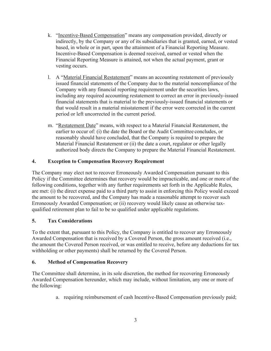3 k. “Incentive-Based Compensation” means any compensation provided, directly or indirectly, by the Company or any of its subsidiaries that is granted, earned, or vested based, in whole or in part, upon the attainment of a Financial Reporting Measure. Incentive-Based Compensation is deemed received, earned or vested when the Financial Reporting Measure is attained, not when the actual payment, grant or vesting occurs. l. A “Material Financial Restatement” means an accounting restatement of previously issued financial statements of the Company due to the material noncompliance of the Company with any financial reporting requirement under the securities laws, including any required accounting restatement to correct an error in previously-issued financial statements that is material to the previously-issued financial statements or that would result in a material misstatement if the error were corrected in the current period or left uncorrected in the current period. m. “Restatement Date” means, with respect to a Material Financial Restatement, the earlier to occur of: (i) the date the Board or the Audit Committee concludes, or reasonably should have concluded, that the Company is required to prepare the Material Financial Restatement or (ii) the date a court, regulator or other legally authorized body directs the Company to prepare the Material Financial Restatement. 4. Exception to Compensation Recovery Requirement The Company may elect not to recover Erroneously Awarded Compensation pursuant to this Policy if the Committee determines that recovery would be impracticable, and one or more of the following conditions, together with any further requirements set forth in the Applicable Rules, are met: (i) the direct expense paid to a third party to assist in enforcing this Policy would exceed the amount to be recovered, and the Company has made a reasonable attempt to recover such Erroneously Awarded Compensation; or (ii) recovery would likely cause an otherwise tax- qualified retirement plan to fail to be so qualified under applicable regulations. 5. Tax Considerations To the extent that, pursuant to this Policy, the Company is entitled to recover any Erroneously Awarded Compensation that is received by a Covered Person, the gross amount received (i.e., the amount the Covered Person received, or was entitled to receive, before any deductions for tax withholding or other payments) shall be returned by the Covered Person. 6. Method of Compensation Recovery The Committee shall determine, in its sole discretion, the method for recovering Erroneously Awarded Compensation hereunder, which may include, without limitation, any one or more of the following: a. requiring reimbursement of cash Incentive-Based Compensation previously paid;
