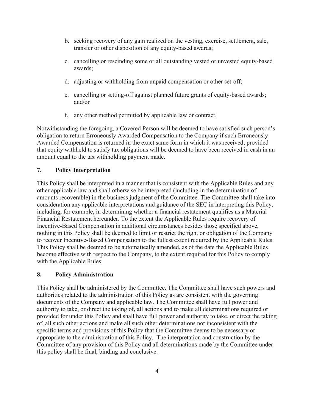 4 b. seeking recovery of any gain realized on the vesting, exercise, settlement, sale, transfer or other disposition of any equity-based awards; c. cancelling or rescinding some or all outstanding vested or unvested equity-based awards; d. adjusting or withholding from unpaid compensation or other set-off; e. cancelling or setting-off against planned future grants of equity-based awards; and/or f. any other method permitted by applicable law or contract. Notwithstanding the foregoing, a Covered Person will be deemed to have satisfied such person’s obligation to return Erroneously Awarded Compensation to the Company if such Erroneously Awarded Compensation is returned in the exact same form in which it was received; provided that equity withheld to satisfy tax obligations will be deemed to have been received in cash in an amount equal to the tax withholding payment made. 7. Policy Interpretation This Policy shall be interpreted in a manner that is consistent with the Applicable Rules and any other applicable law and shall otherwise be interpreted (including in the determination of amounts recoverable) in the business judgment of the Committee. The Committee shall take into consideration any applicable interpretations and guidance of the SEC in interpreting this Policy, including, for example, in determining whether a financial restatement qualifies as a Material Financial Restatement hereunder. To the extent the Applicable Rules require recovery of Incentive-Based Compensation in additional circumstances besides those specified above, nothing in this Policy shall be deemed to limit or restrict the right or obligation of the Company to recover Incentive-Based Compensation to the fullest extent required by the Applicable Rules. This Policy shall be deemed to be automatically amended, as of the date the Applicable Rules become effective with respect to the Company, to the extent required for this Policy to comply with the Applicable Rules. 8. Policy Administration This Policy shall be administered by the Committee. The Committee shall have such powers and authorities related to the administration of this Policy as are consistent with the governing documents of the Company and applicable law. The Committee shall have full power and authority to take, or direct the taking of, all actions and to make all determinations required or provided for under this Policy and shall have full power and authority to take, or direct the taking of, all such other actions and make all such other determinations not inconsistent with the specific terms and provisions of this Policy that the Committee deems to be necessary or appropriate to the administration of this Policy. The interpretation and construction by the Committee of any provision of this Policy and all determinations made by the Committee under this policy shall be final, binding and conclusive.