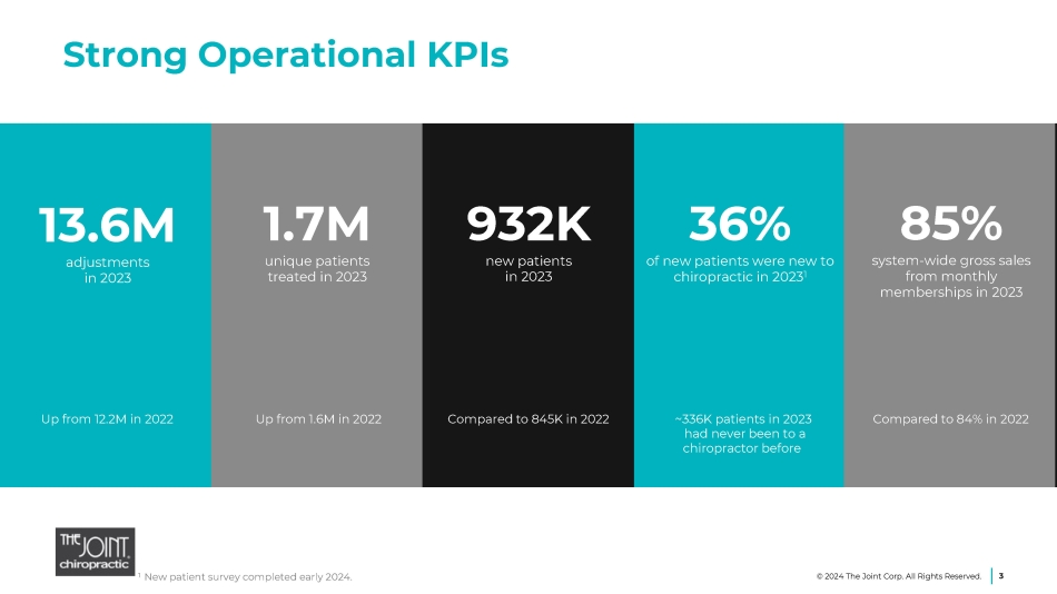 Safe Harbor Statements Certain statements contained in this presentation are "forward - looking statements” about future events and expectations. Forward - looking statements are based on our beliefs, assumptions and expectations of industry trends, our future financial and operating performance and our growth plans, taking into account the information currently available to us. These statements are not statements of historical fact. Words such as, "anticipates," "believes," "continues," "estimates," "expects," "goal," "objectives," "intends," "may," "opportunity," "plans," "potential," "near - term," "long - term," "projections," "assumptions," "projects," "guidance," "forecasts," "outlook," "target," "trends," "should," "could," "would," "will," and similar expressions are intended to identify such forward - looking statements. . Specific forward looking statements made in this presentation include, among others our refranchising strategy; our implementation of new marketing programs; 2024 guidance for system - wide sales, system - wide comp sales for all clinics open 13 months or more, and new franchised clinic openings excluding the impact of refranchised clinics; our belief that people will continue to seek more noninvasive, holistic ways to manage their pain and that we’ll be there to treat them; our leading chiropractic care franchise concept; our mission to improve quality of life through routine and affordable chiropractic care; our upside for future growth; our substantial opportunity for market share growth; and our growing market opportunity. Forward - looking statements involve risks and uncertainties that may cause our actual results to differ materially from the expectations of future results we express or imply in any forward - looking statements, and you should not place undue reliance on such statements. Factors that could contribute to these differences include, but are not limited to, our inability to identify and recruit enough qualified chiropractors and other personnel to staff our clinics, due in part to the nationwide labor shortage and an increase in operating expenses due to measures we may need to take to address such shortage; inflation, and the current war in Ukraine, which has increased our costs and which could otherwise negatively impact our business; the potential for disruption to our operations and the unpredictable impact on our business of outbreaks of contagious diseases; our failure to profitably operate company - owned or managed clinics; short - selling strategies and negative opinions posted on the internet, which could drive down the market price of our common stock and result in class action lawsuits; our failure to remediate future material weaknesses in our internal control over financial reporting, which could negatively impact our ability to accurately report our financial results, prevent fraud, or maintain investor confidence; and other factors described in our filings with the SEC, including in the section entitled “Risk Factors” in our Annual Report on Form 10 - K/A for the year ended December 31, 2022 filed with the SEC on September 26, 2023 and subsequently - filed current and quarterly reports. We qualify any forward - looking statements entirely by these cautionary factors. We assume no obligation to update or revise any forward - looking statements for any reason or to update the reasons actual results could differ materially from those anticipated in these forward - looking statements, even if new information becomes available in the future. Comparisons of results for current and any prior periods are not intended to express any future trends or indications of future performance, unless expressed as such, and should only be viewed as historical data. Business Structure The Joint Corp. is a franchisor of clinics and an operator of clinics in certain states. In Arkansas, California, Colorado, District of Columbia, Florida, Illinois, Kansas, Kentucky, Maryland, Michigan, Minnesota, New Jersey, New York, North Carolina, Oregon, Pennsylvania, Rhode Island, South Dakota, Tennessee, Washington, West Virginia and Wyoming. The Joint Corp. and its franchisees provide management services to affiliated professional chiropractic practices. 2 © 2024 The Joint Corp. All Rights Reserved.